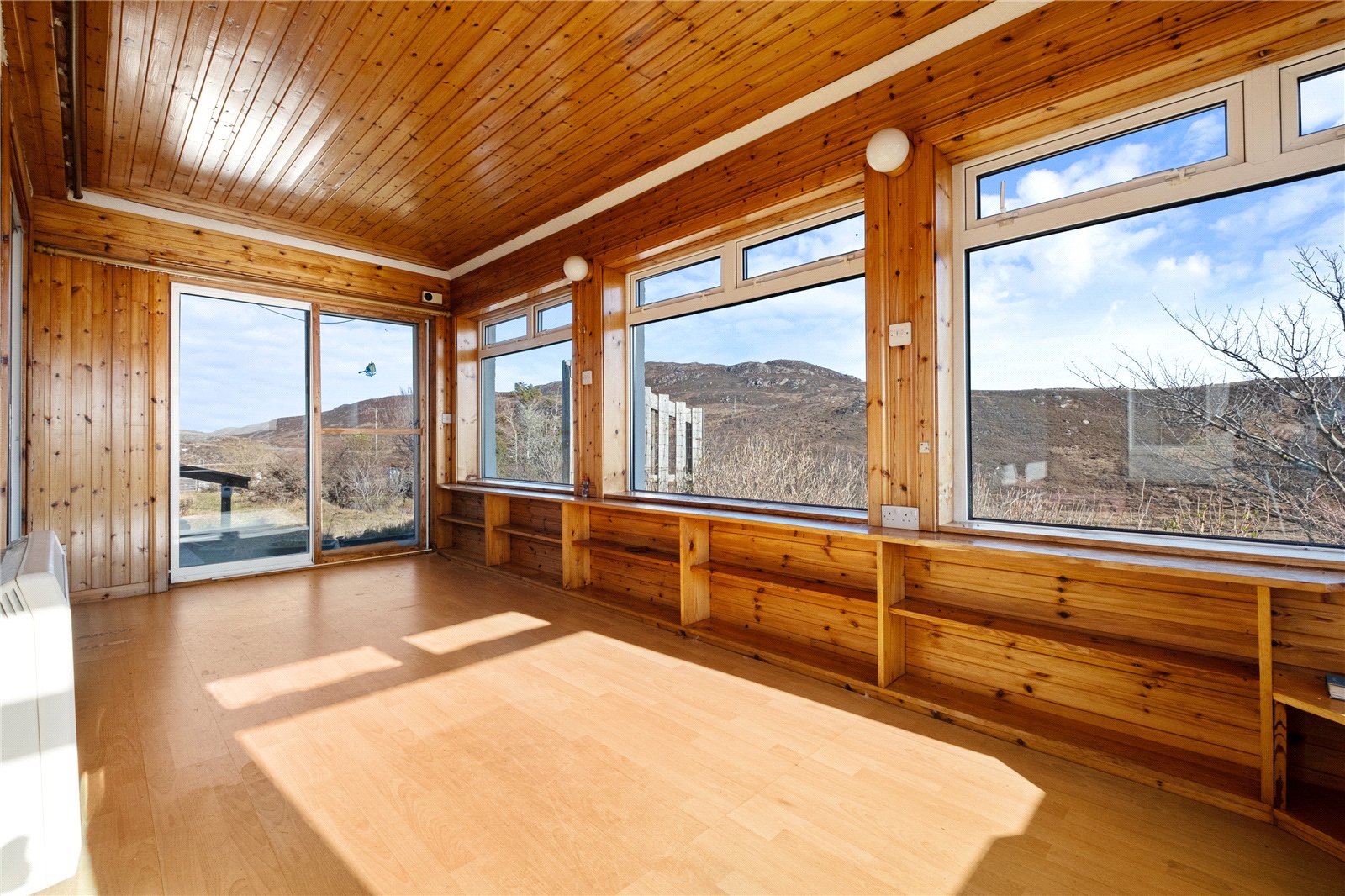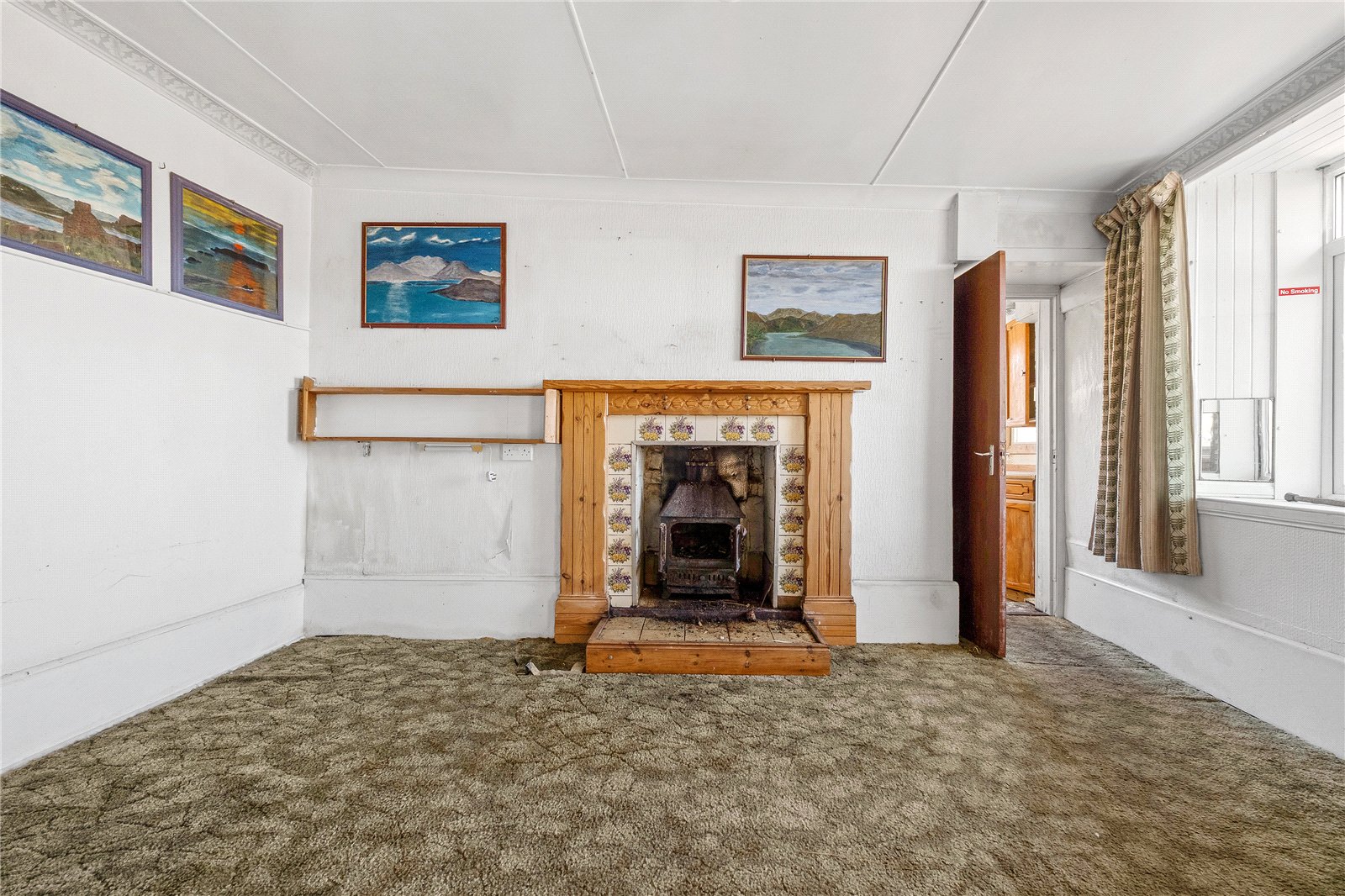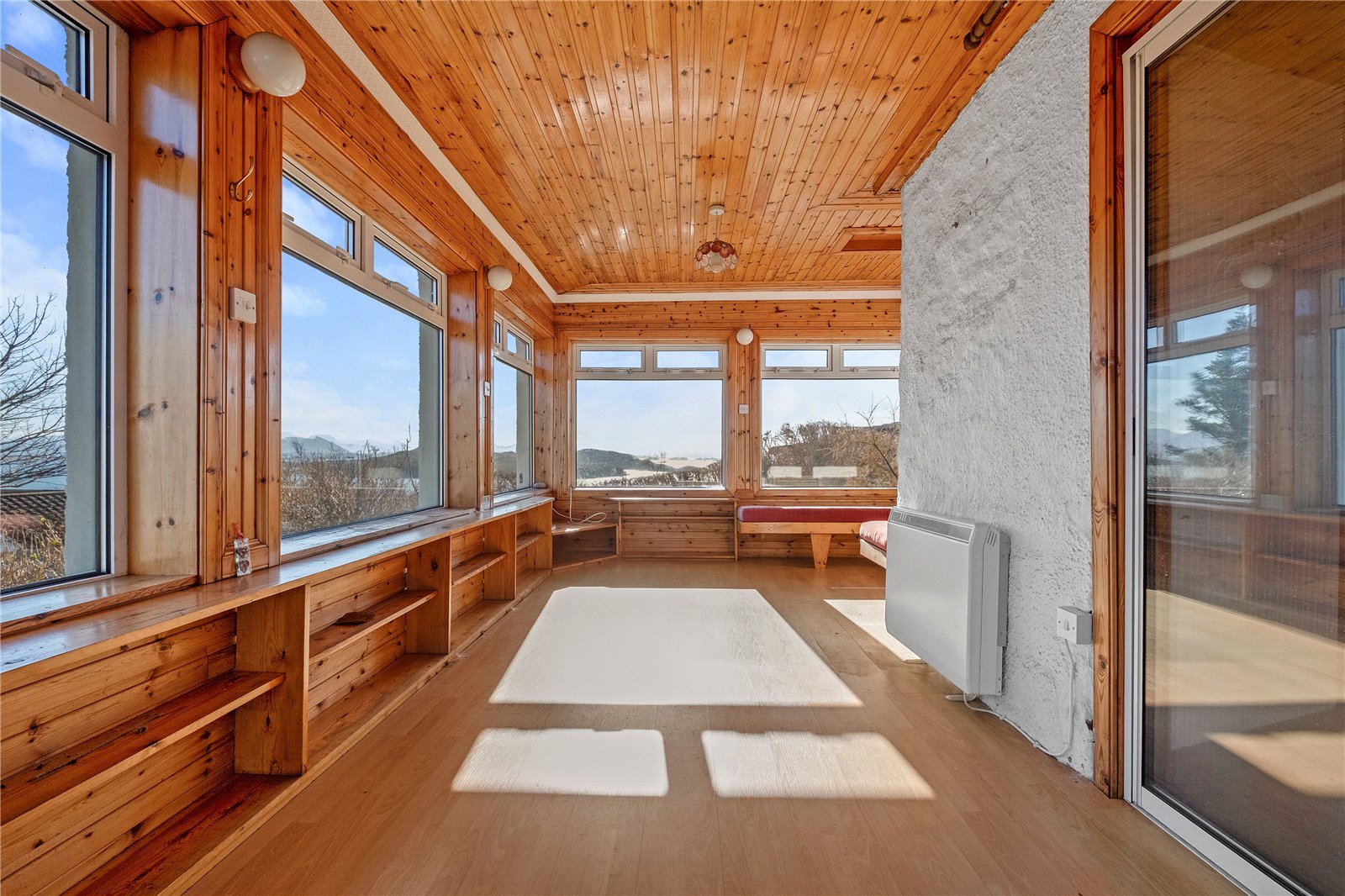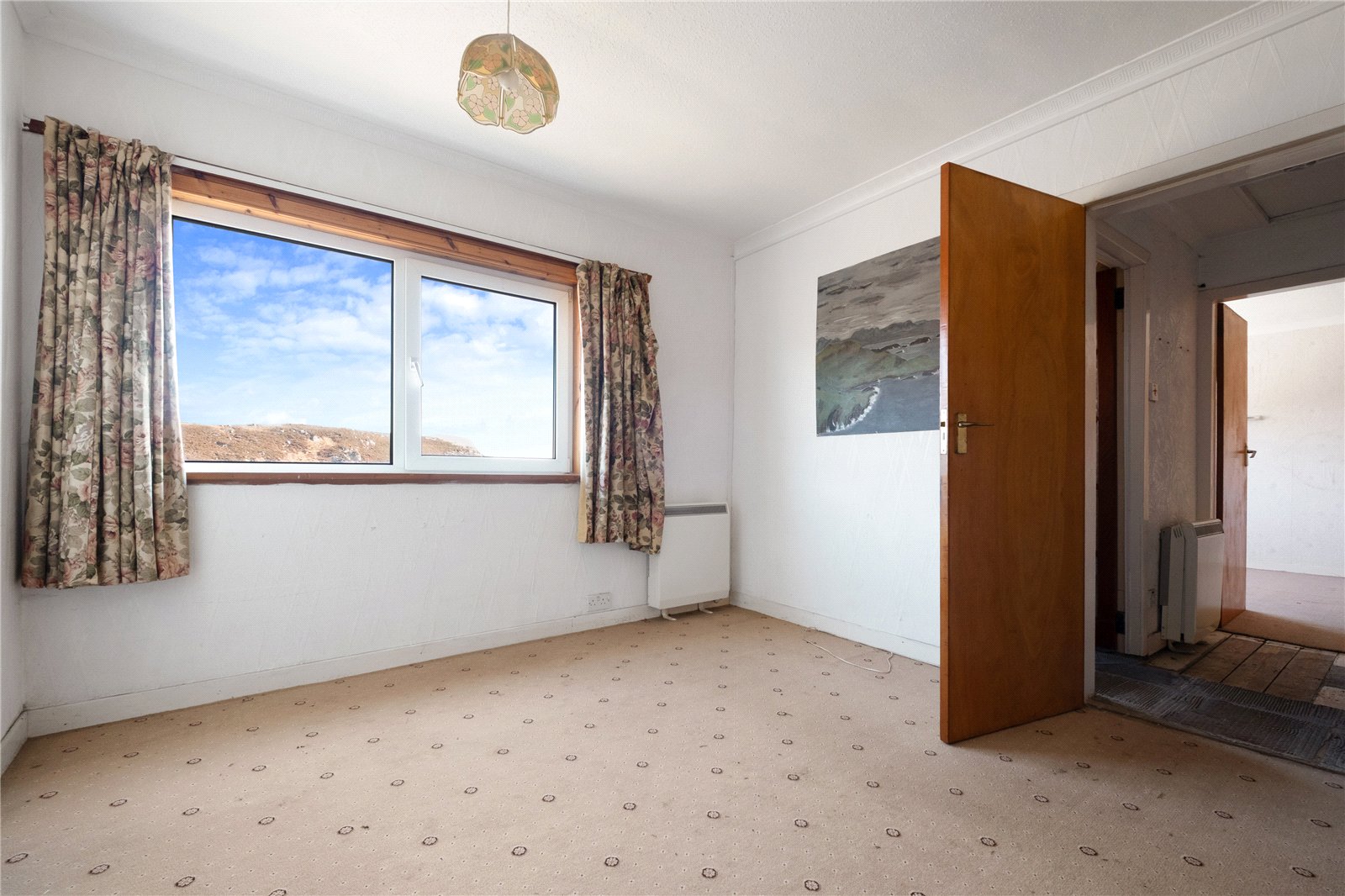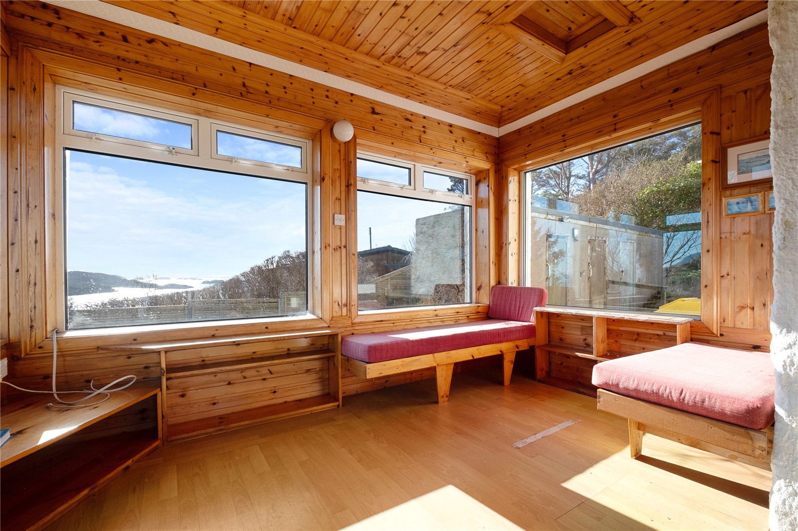 An external door gives access to the main property. This opens into a spacious sitting room with a front-facing window enjoying open water views. There is a wood-burning stove set on a tiled hearth with tiled surround and wooden mantle, along with a built-in cupboard. From here, a door leads to a double bedroom, again with a front-facing window and open views, and an en-suite shower room comprising WC, wash hand basin and shower.