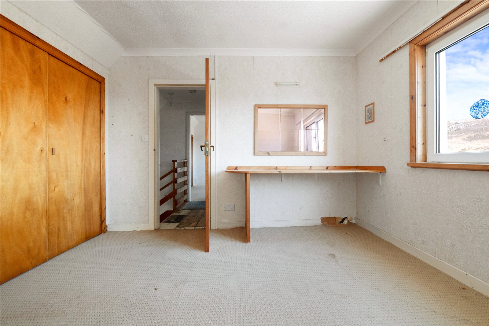 A staircase rises from the sitting room to the upper floor, where there are two double bedrooms, both enjoying open aspects, and a family bathroom fitted with WC, wash hand basin and bath. Both bedrooms have built-in double wardrobes, providing excellent storage.