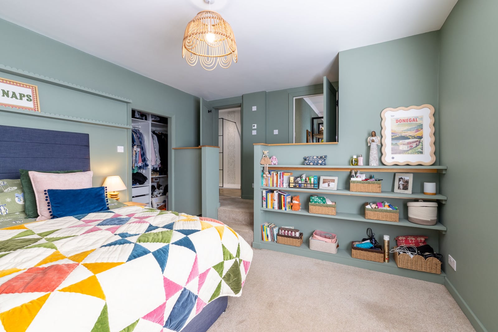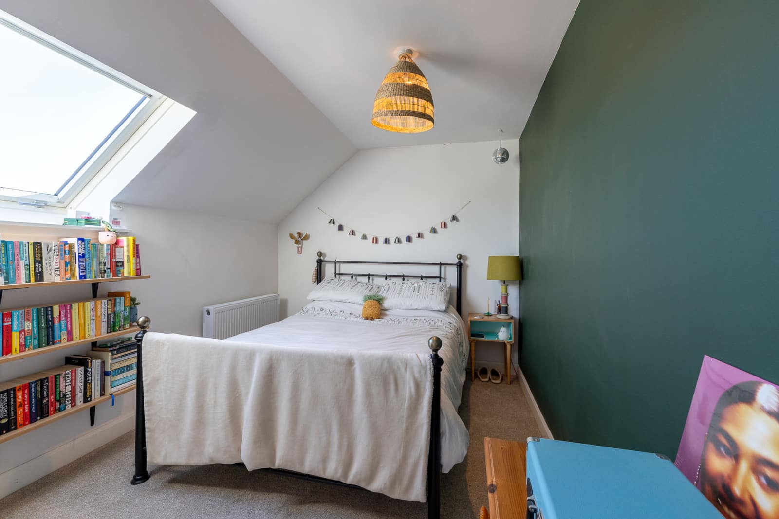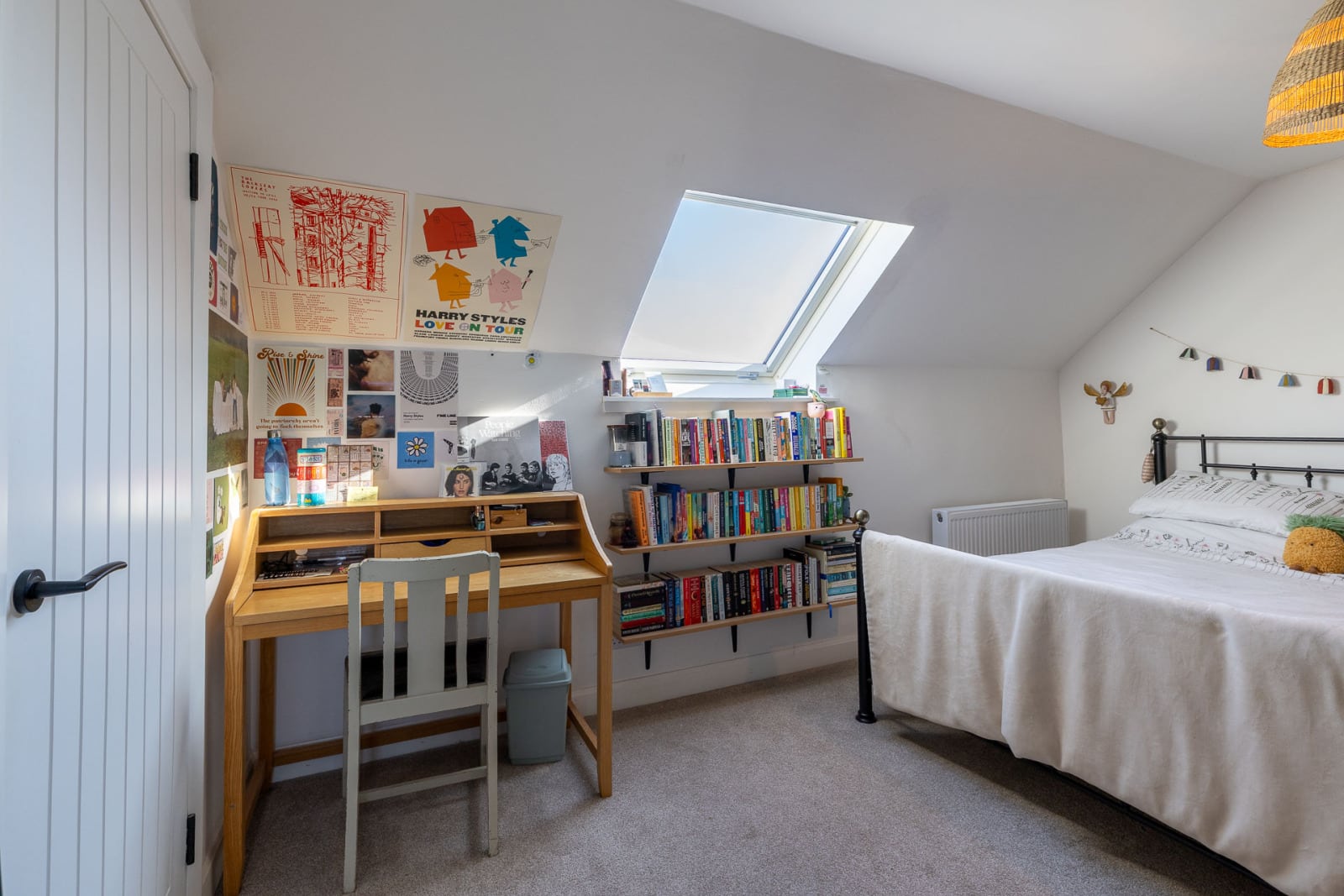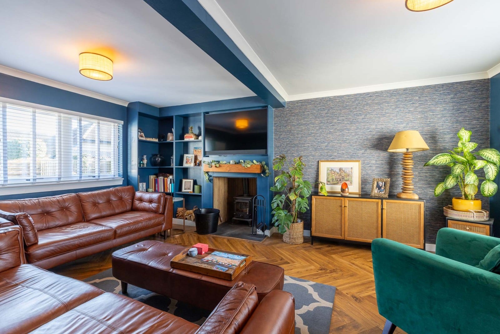 The large sitting room has windows on two sides and a focal wood burning stove set on a slate hearth. Bespoke book and display shelving complement the space beautifully.