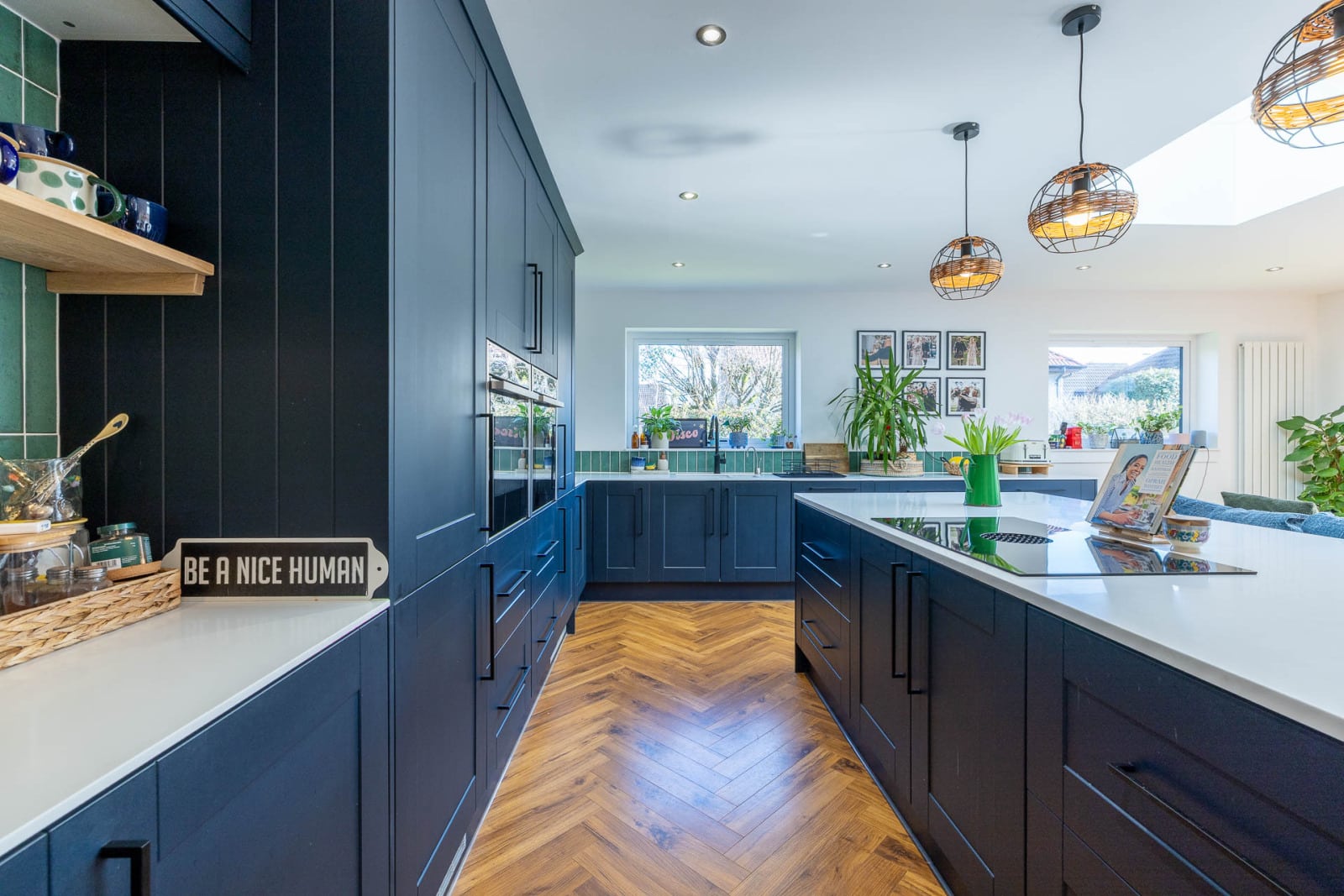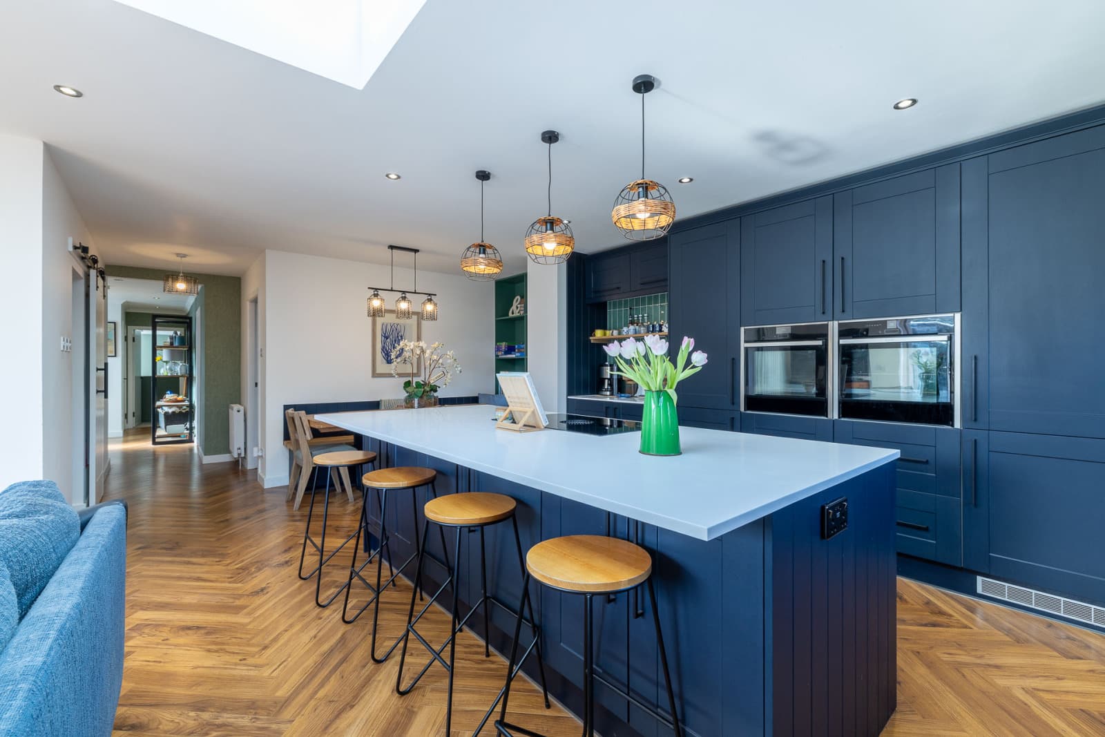 A glazed door with matching side panel opens into a welcoming hallway. With the exception of the bedrooms, the ground floor features a striking herringbone walnut floor that draws the eye through the public areas of the home.