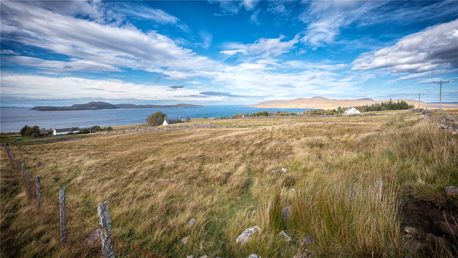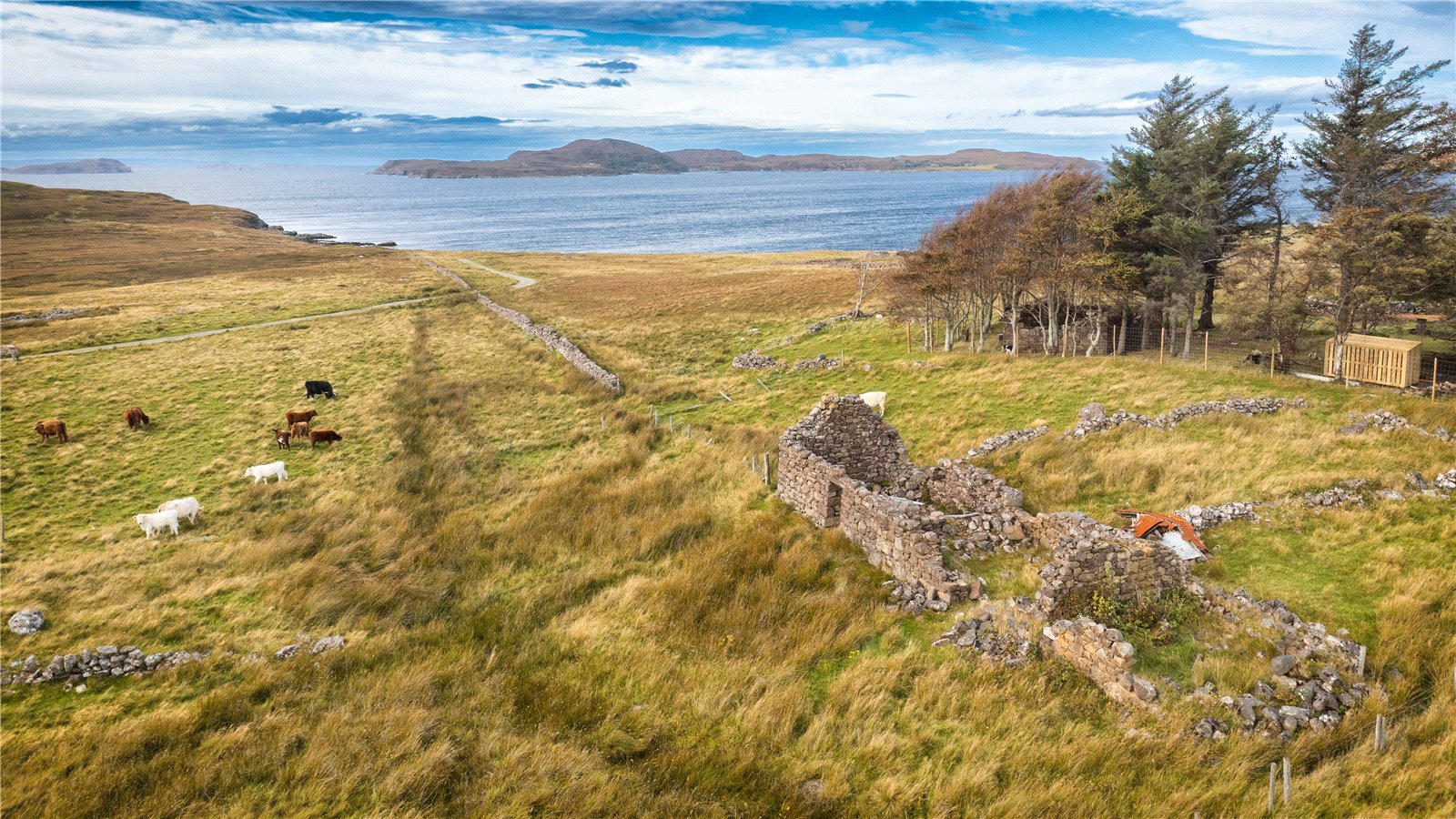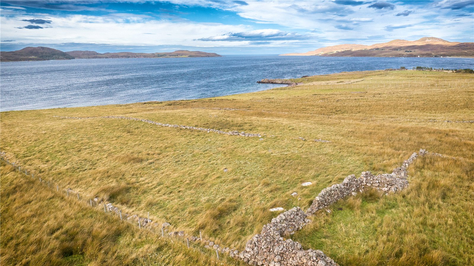 The land for sale measures approx. 8.69ha (21.49 acres) and consists of croftland plus two decrofted plots with potential for development. The croftland is in two separate parcels – the larger area extending from the public road down to the foreshore and a smaller area 0.68 ha (1.68acres) lying on the north side of the public road. The croftland is registered with the Crofting Commission as two separate crofts and offers permanent grassland and rough grazing suitable for cattle or sheep.