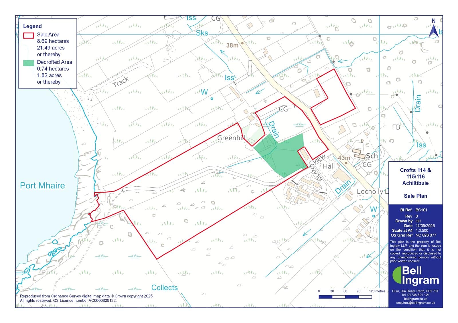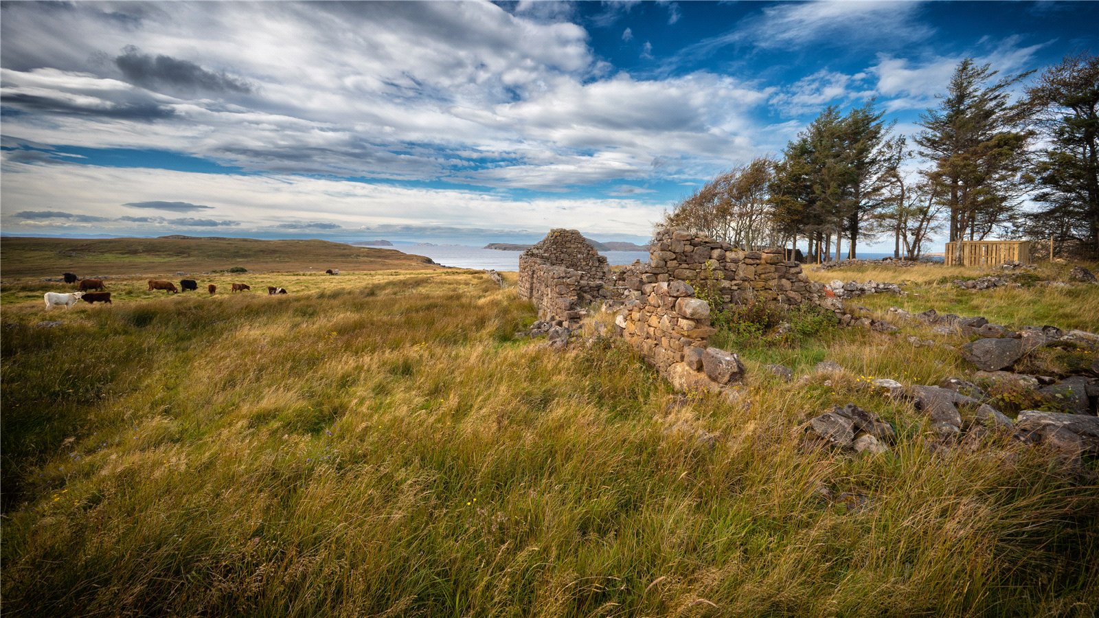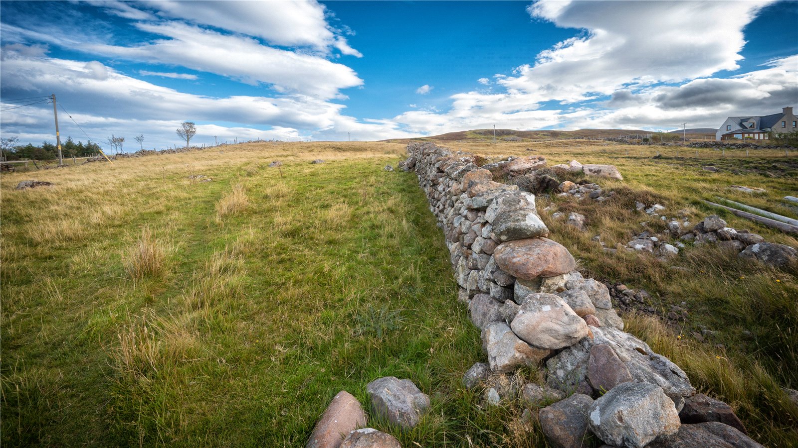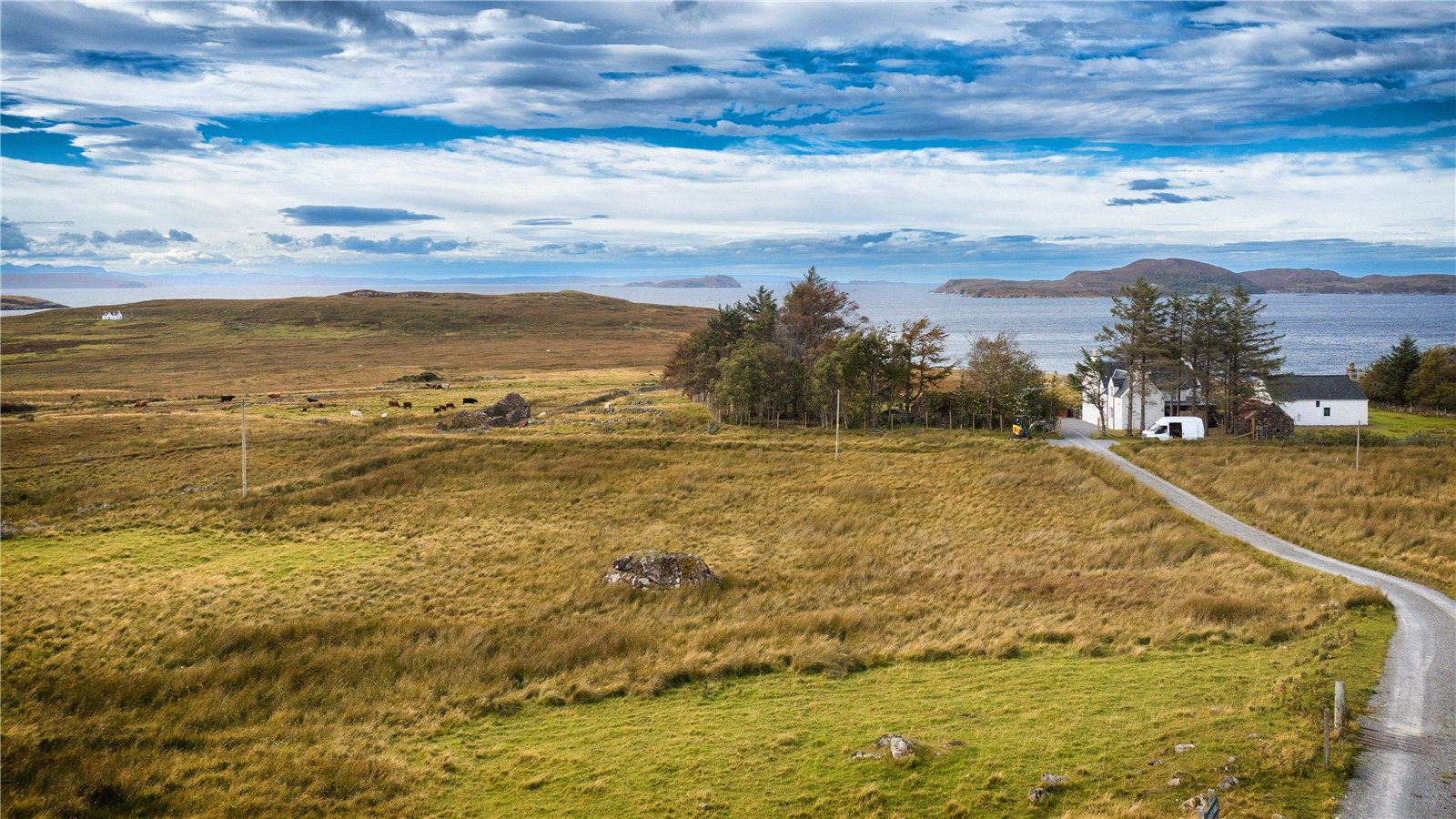 The land for sale measures approx. 8.69ha (21.49 acres) and consists of croftland plus two decrofted plots with potential for development. The croftland is in two separate parcels – the larger area extending from the public road down to the foreshore and a smaller area 0.68 ha (1.68acres) lying on the north side of the public road. The croftland is registered with the Crofting Commission as two separate crofts and offers permanent grassland and rough grazing suitable for cattle or sheep.