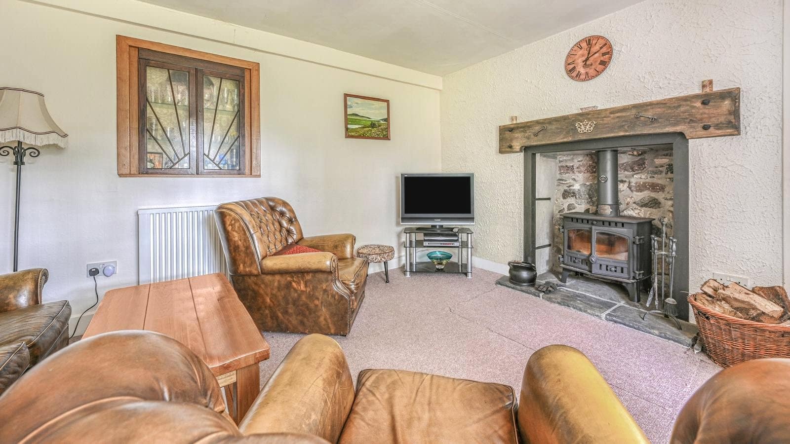 A door leads to the hallway which has a built-in storage cupboard. There is an external door to the front garden, stairs to the upper floor and access to the sitting room, which again has a window to the front and a central feature of large fireplace, with inset woodburning stove on a stone hearth with wooden mantle.