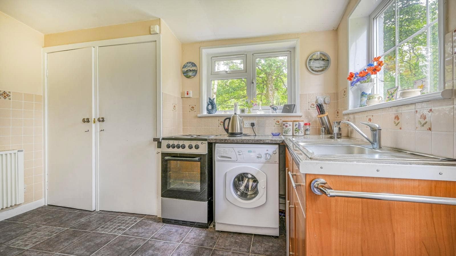 An opening leads to the kitchen which then has a tiled floor. There are two large built-in storage cupboards and a good range of units in walnut effect with a granite effect worksurface. There is a Creda washing machine, electric oven with four-ring hob and Lec fridge freezer. Dual aspect windows to the front and side overlook the gardens. A door leads to the front garden.