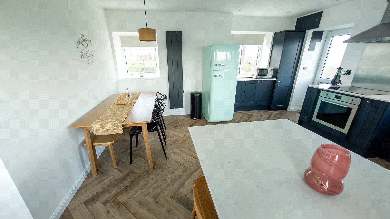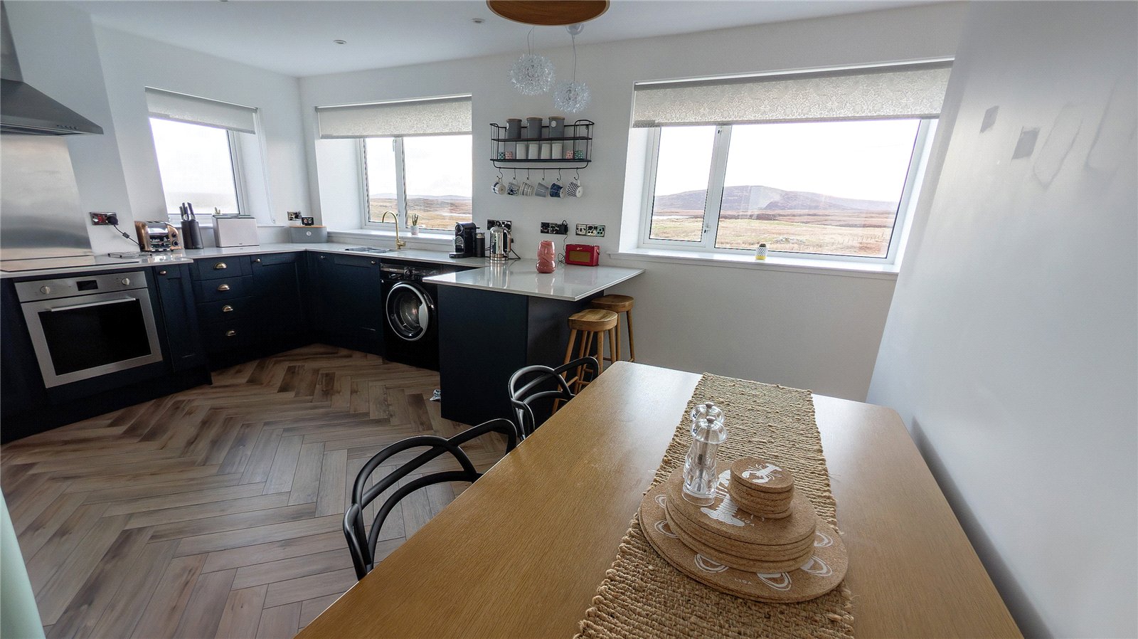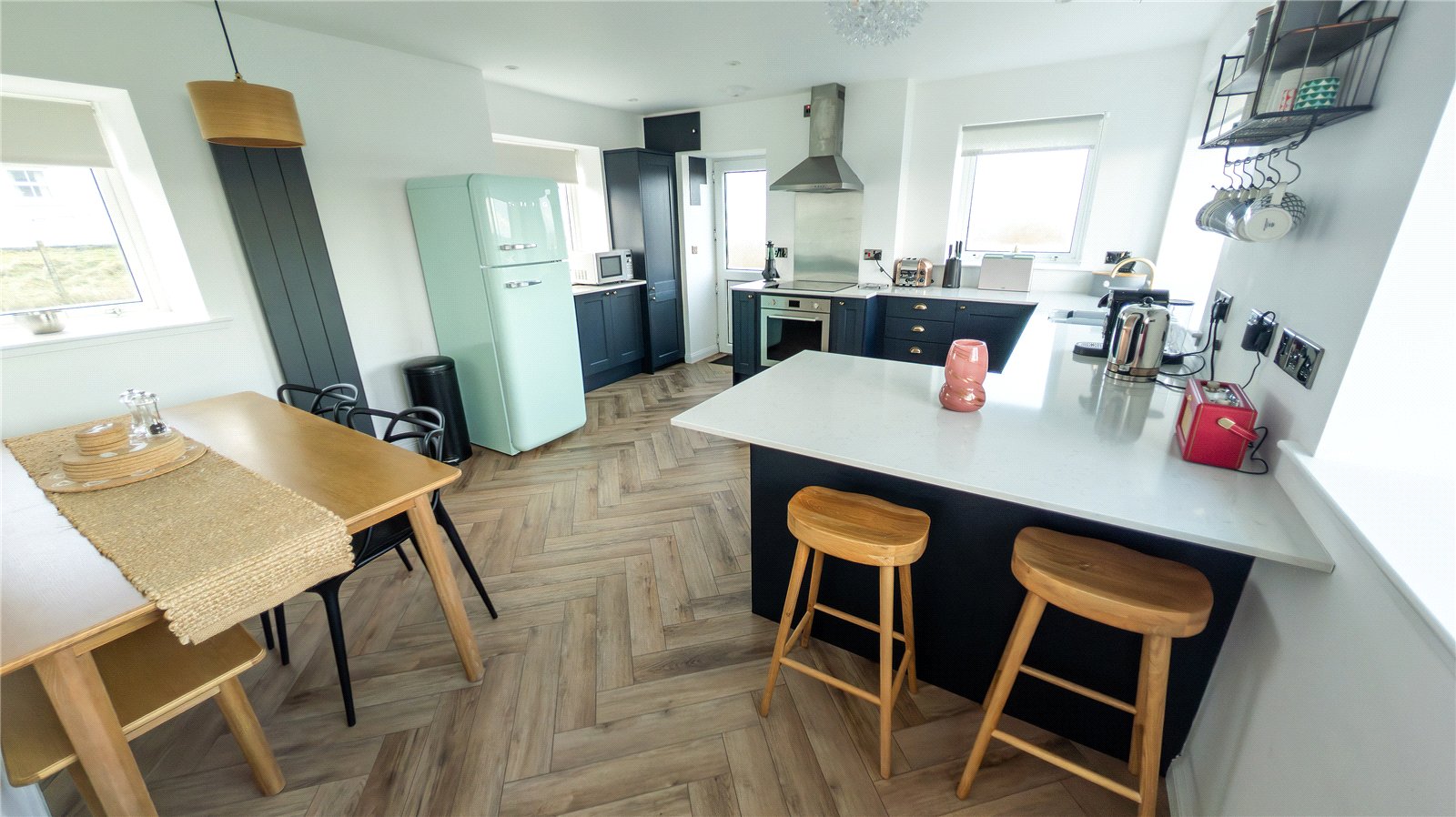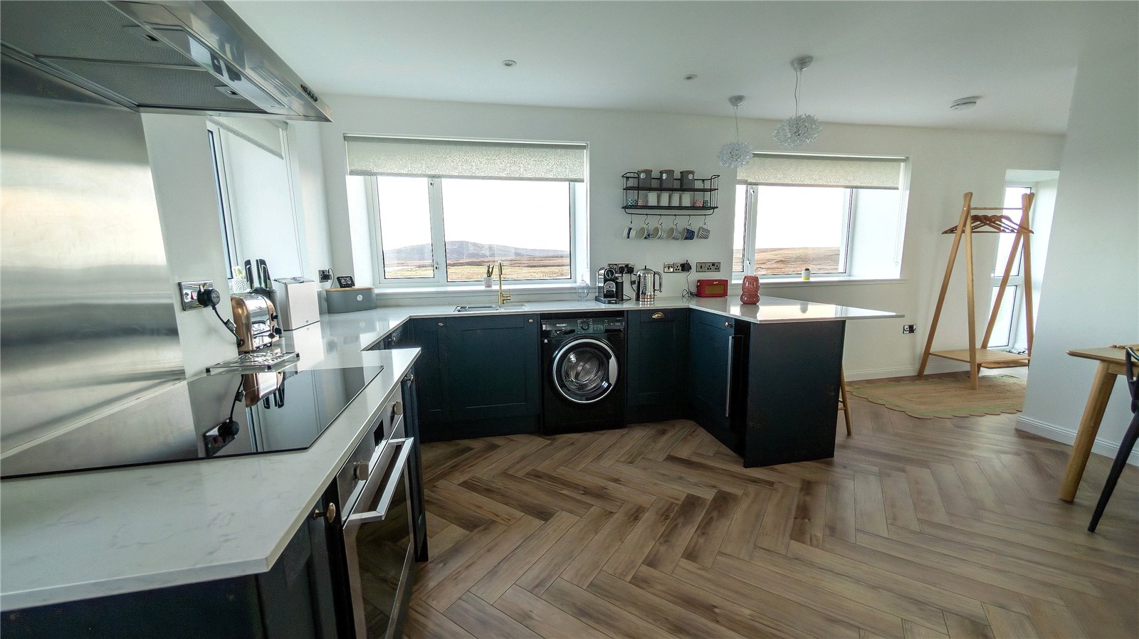 Park Cottage is accessed via a UPVC door to the hallway. To the right is the kitchen which is fitted with navy blue units with quartz worksurface. There is an integrated dishwasher. Hotpoint washing machine and integrated oven with four ring ceramic hob. There is space for a free-standing fridge freezer and plenty room for a large dining table. There are windows to the front and side, and a door leads to the garden.