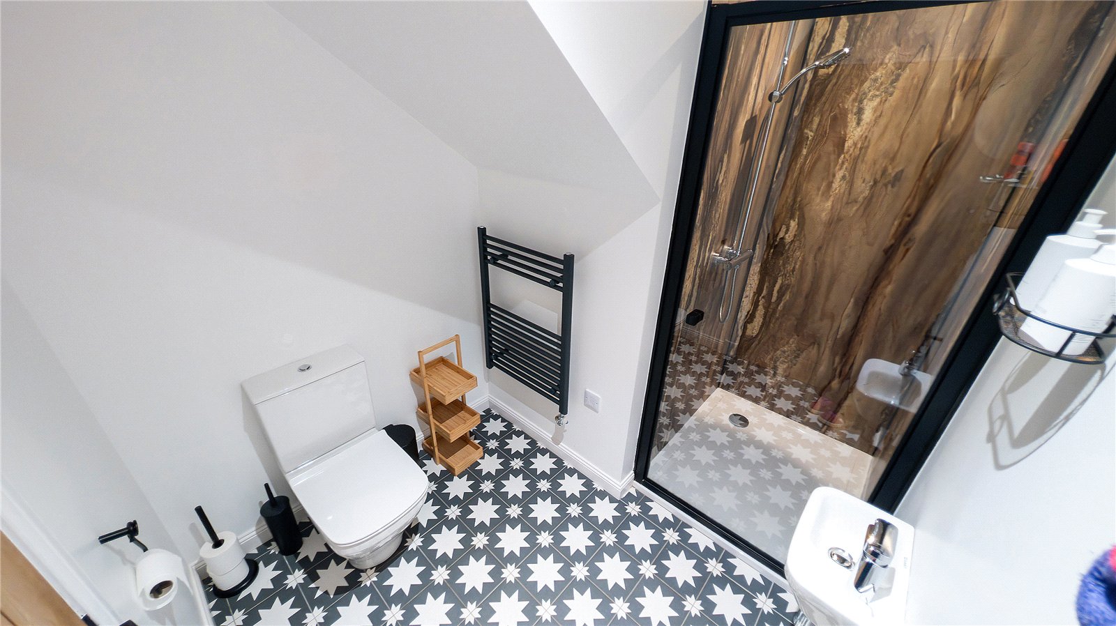 Off the hall is a shower room with WC and wash handbasin in white and shower cubicle with wet wall panelling around.