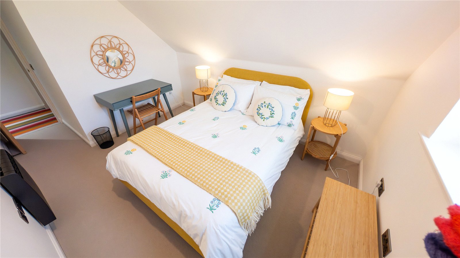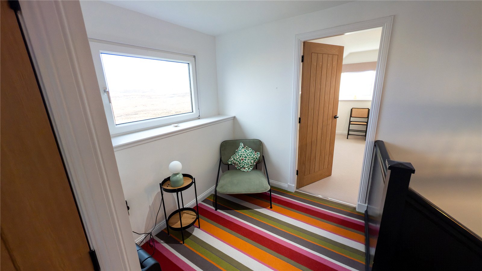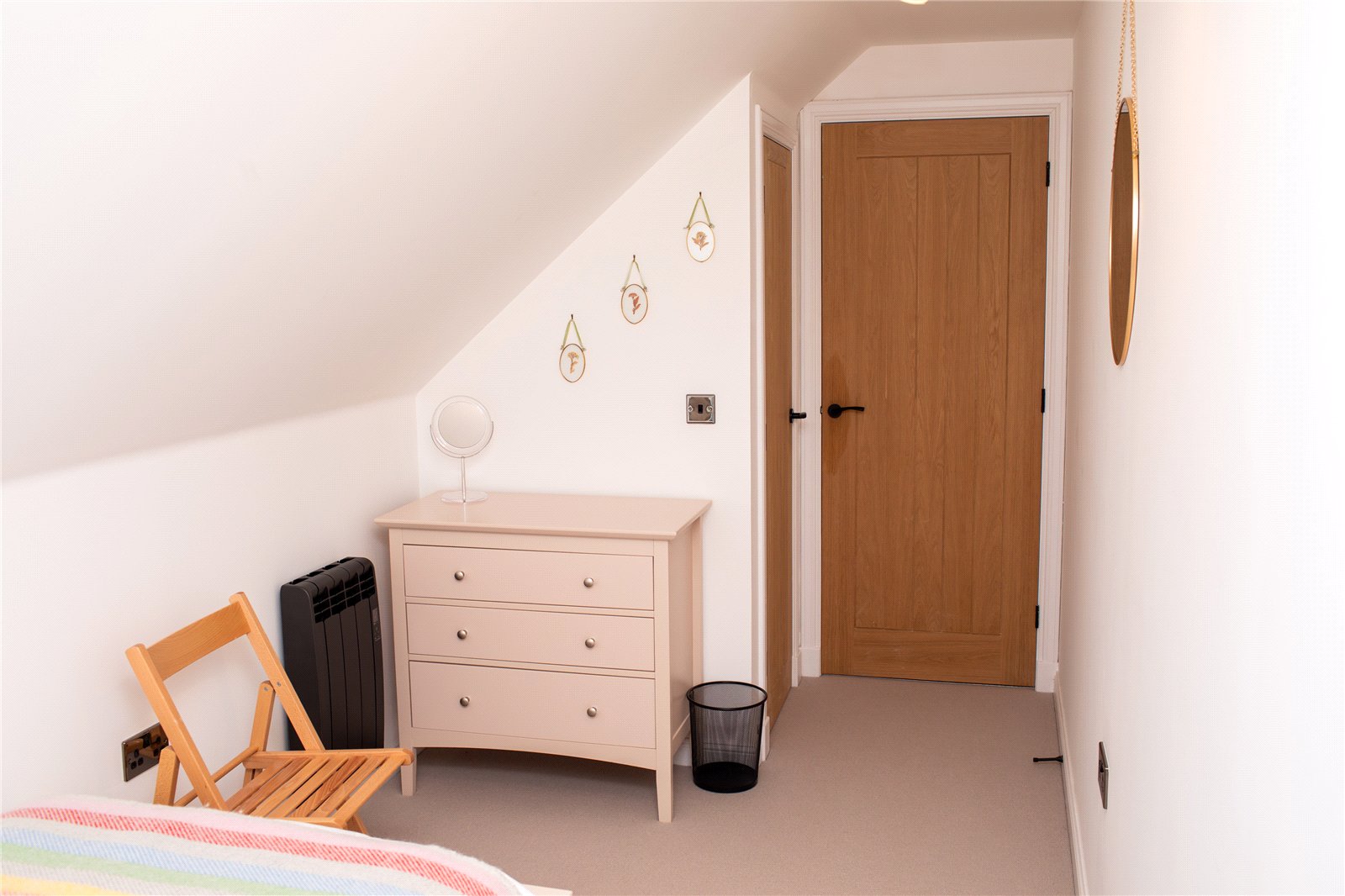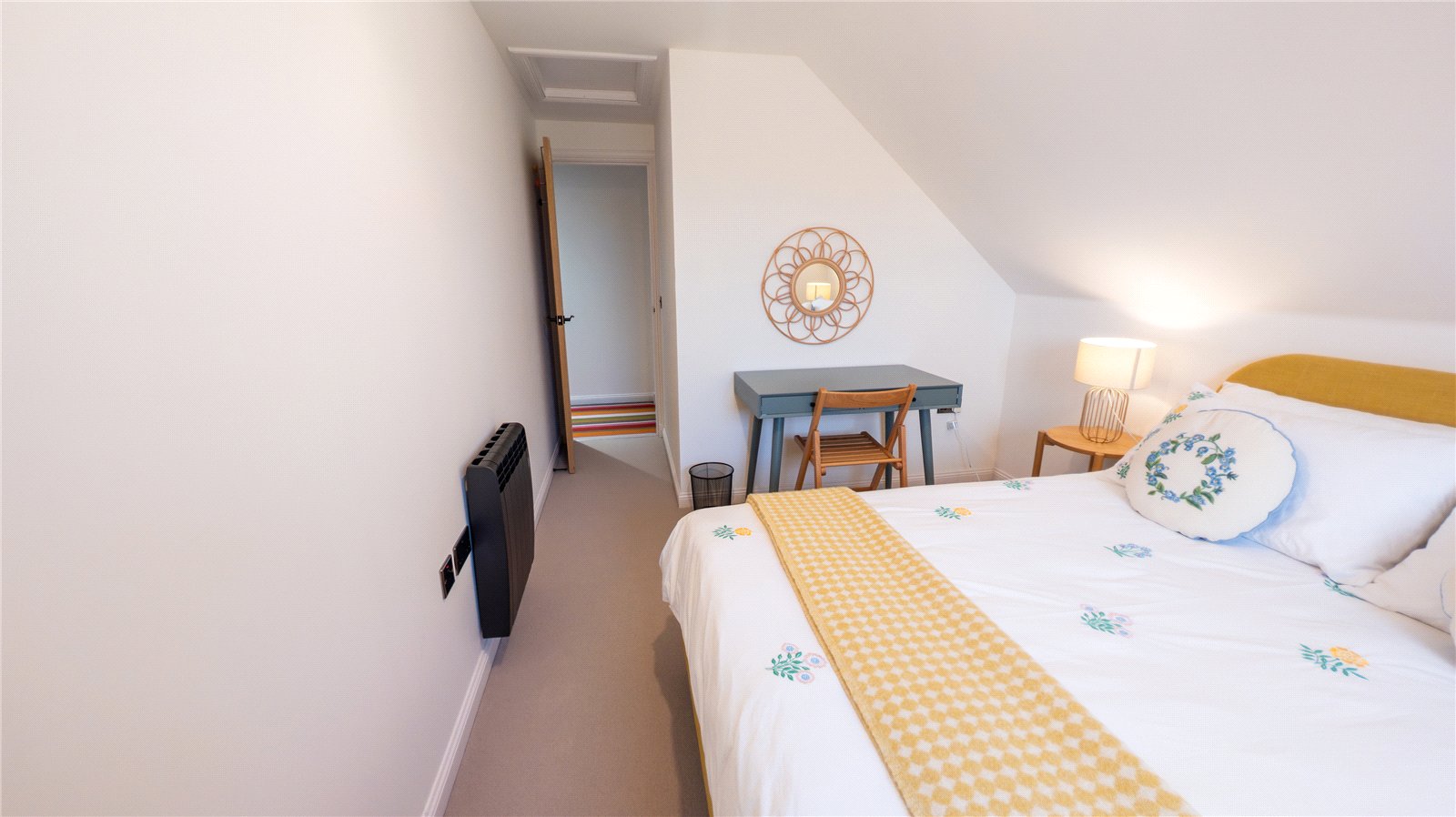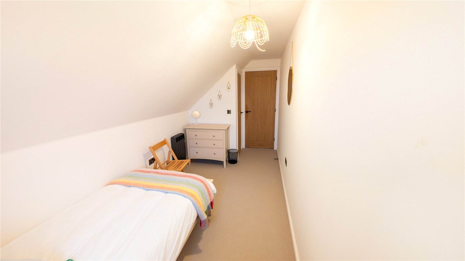Stairs rise from the hall to the upper floor landing which has a built-in storage cupboard. To the right is a large double bedroom with a window to the side enjoying rural views. To the left is a single bedroom which has a window to side with views to the nearby beach. It has a built-in single wardrobe. The third bedroom is a double room window to the side, again enjoying views to the beach and sea.