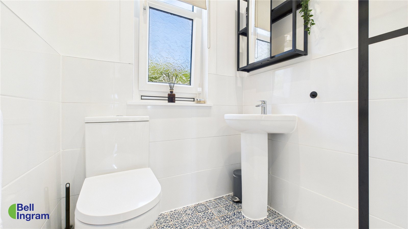 A door to the rear of the lounge gives access to the principal bedroom, a stylish room which looks out to the rear gardens. An alcove has cleverly been adapted as a built-in dressing table. The layout offers plenty of space for a free-standing wardrobe.