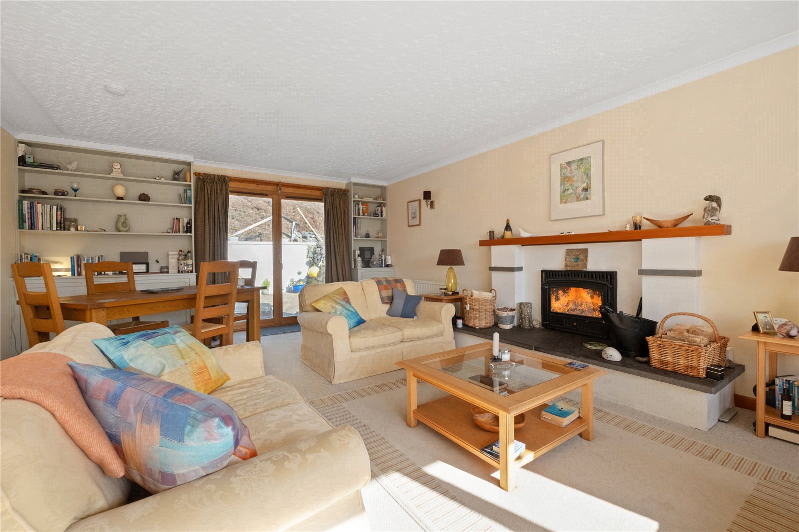 To the right, the bright and generously proportioned sitting room has a large picture window to the front and patio doors to the rear, providing direct access to the garden. A multi-fuel stove set on a slate hearth with a wooden mantle creates a charming focal point. There are two dresser style storage cupboards with shelving above.