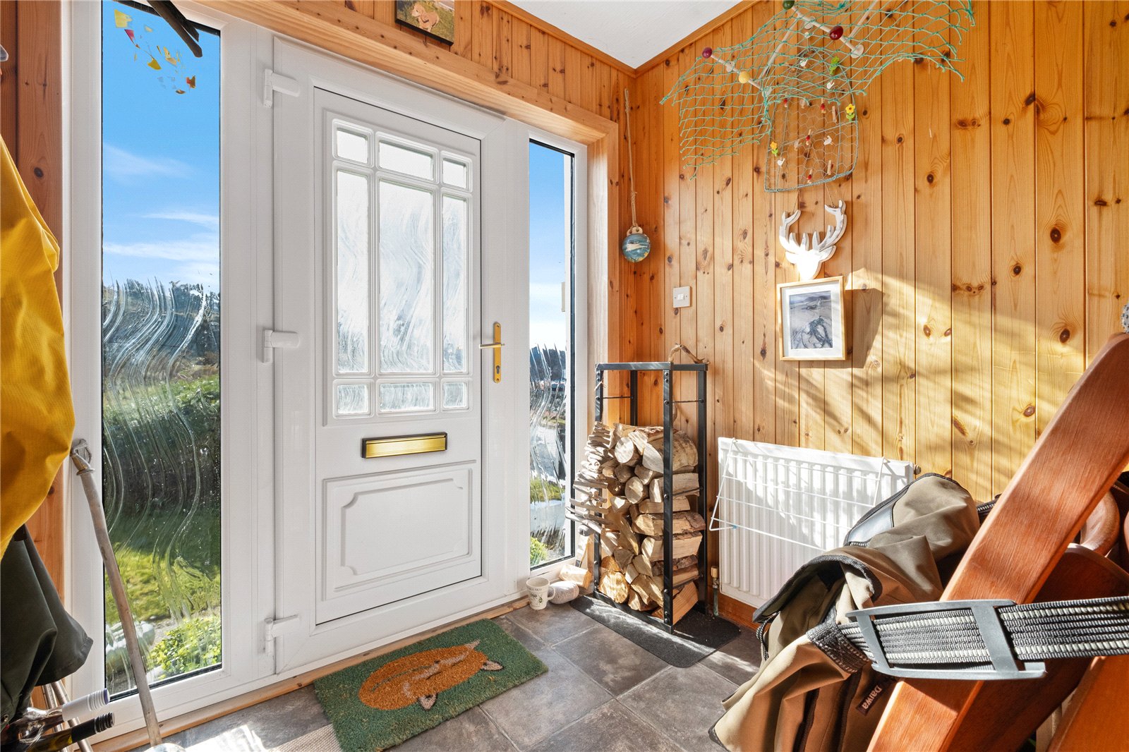 A gate leads from the road to a path and thereafter to four steps and a UPVC door, which opens into an entrance vestibule. The entrance features wood panelling and a tiled floor, with a glazed door leading into the main hallway which has a useful understairs store.