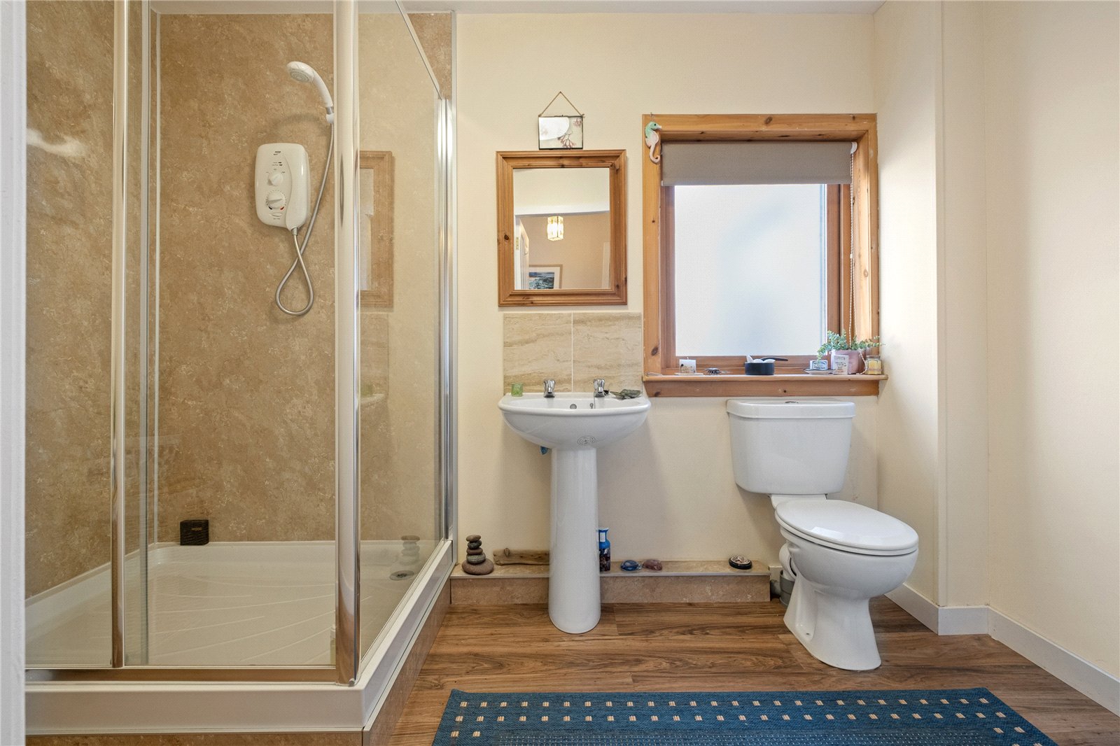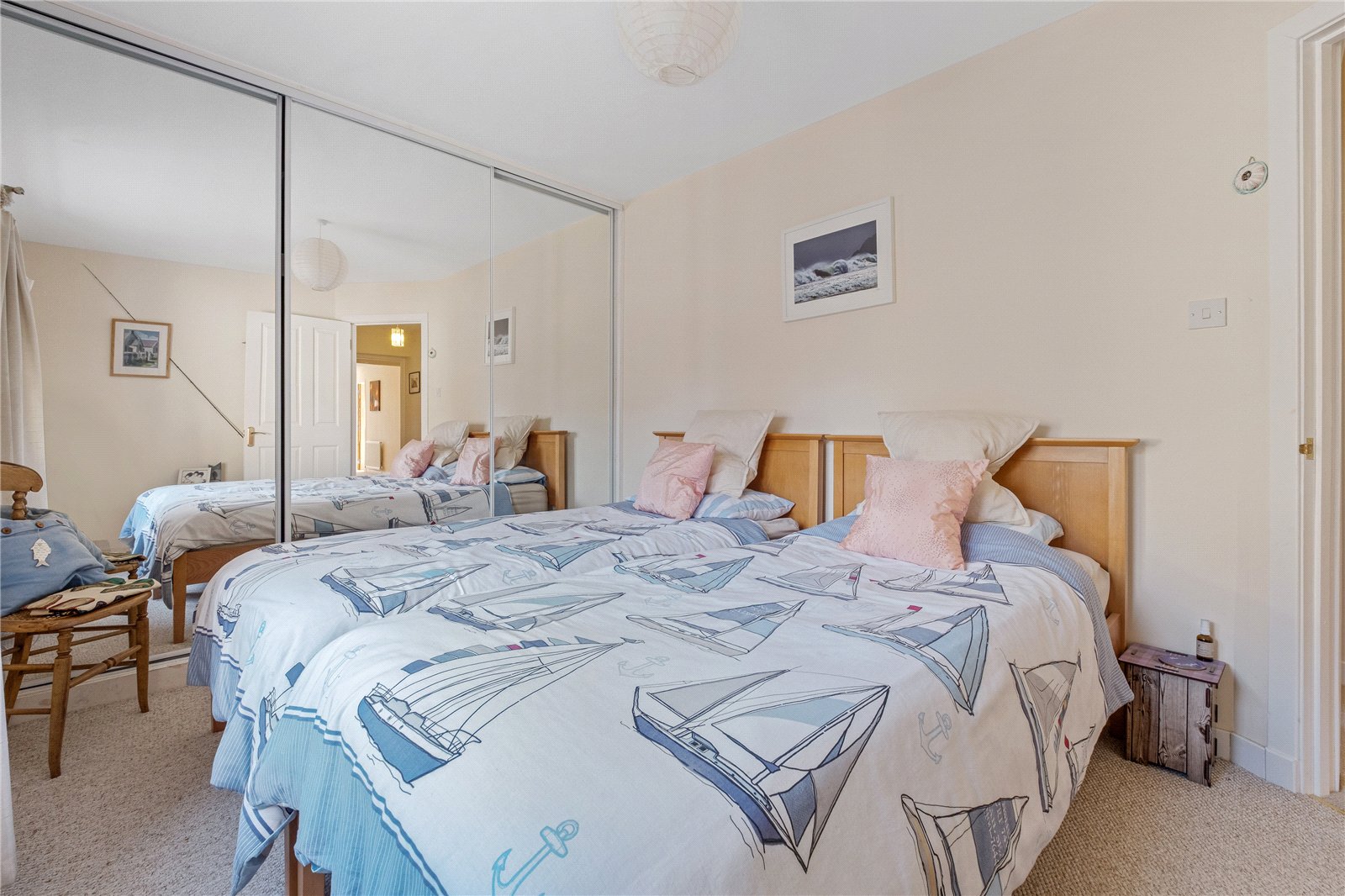 An inner hallway with built-in storage gives access to two double bedrooms. Bedroom two has floor-to-ceiling mirrored wardrobes, while bedroom three enjoys views over the garden. The ground floor is completed by a shower room comprising WC, wash hand basin and a large walk-in shower with electric shower.