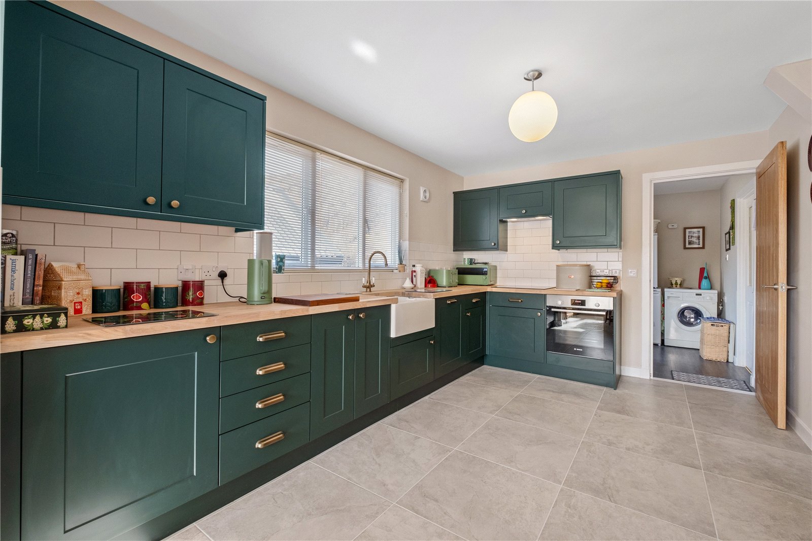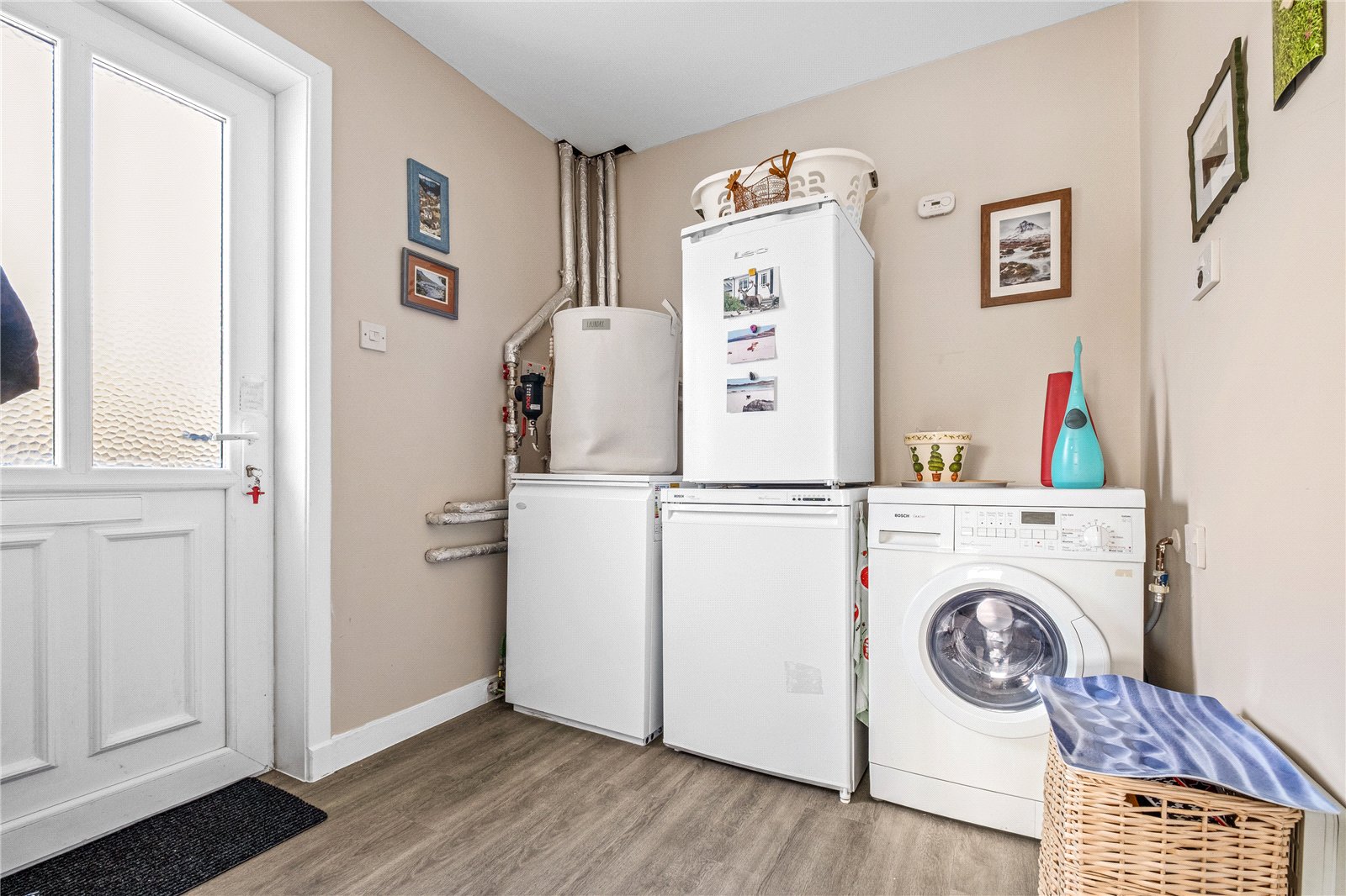 A door leads through to the utility room, which houses a Bosch washing machine, fridge and separate Bosch freezer. A door opens to the driveway.