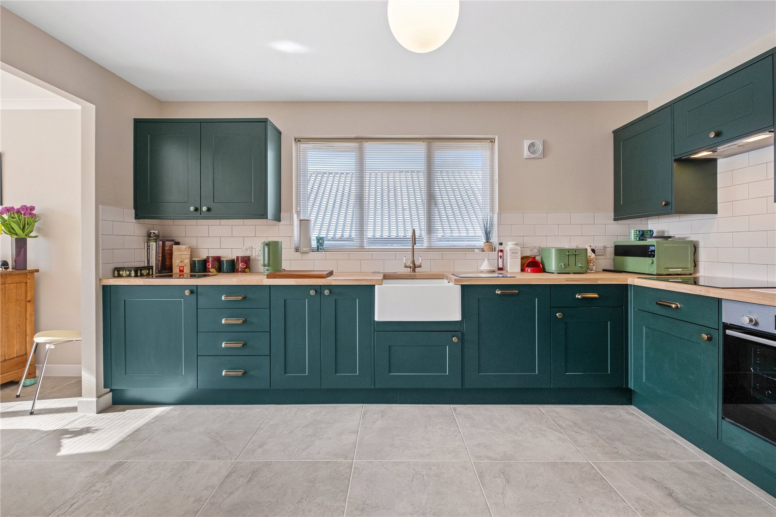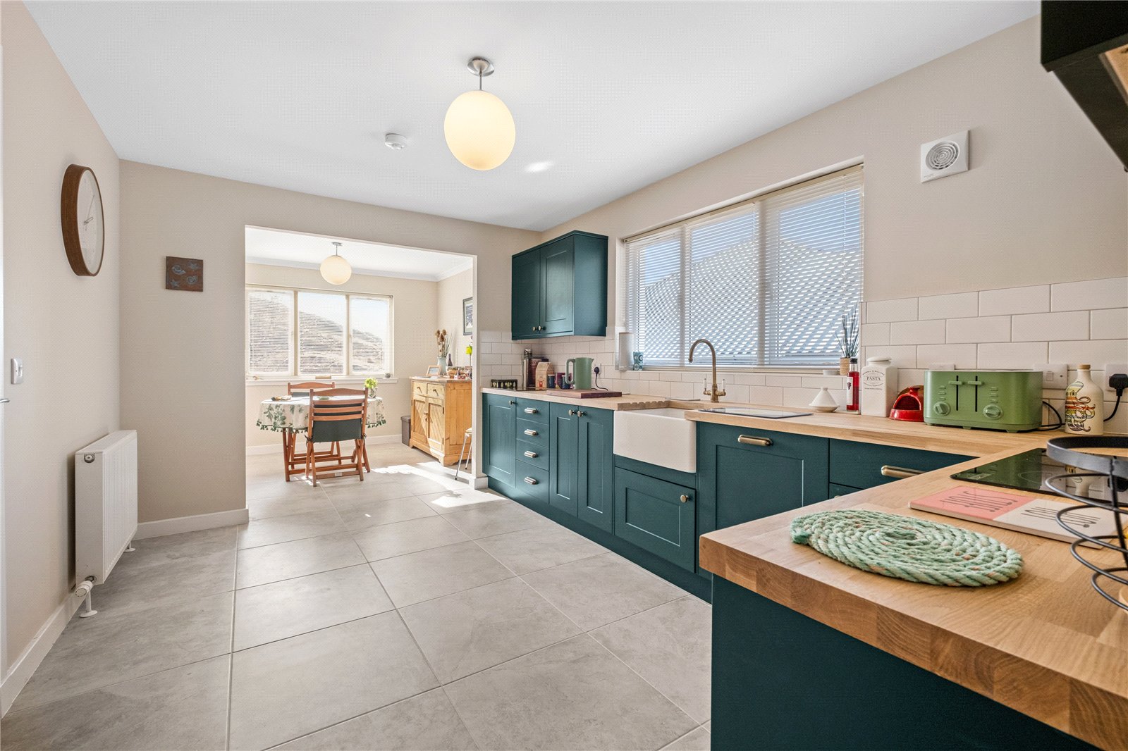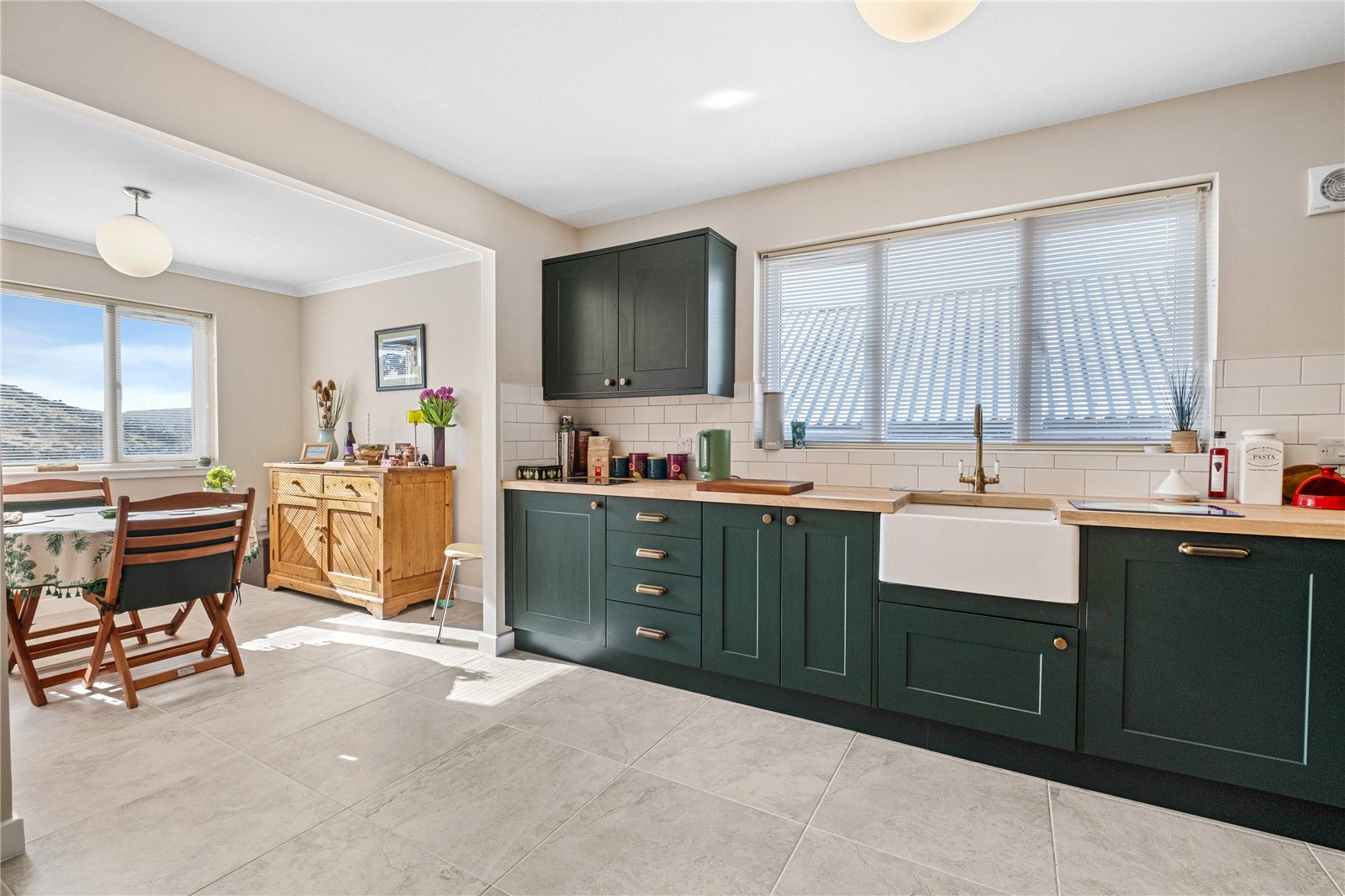 To the left of the hall is the kitchen/dining room, fitted with an excellent range of floor and wall units in a stylish bottle green finish with wooden work surfaces. The kitchen is well equipped with a Belfast sink and integrated Bosch appliances including an oven, ceramic hob, dishwasher and fridge. It has quality tiled flooring. The dining area offers ample space for a large table, ideal for both everyday family use and entertaining.