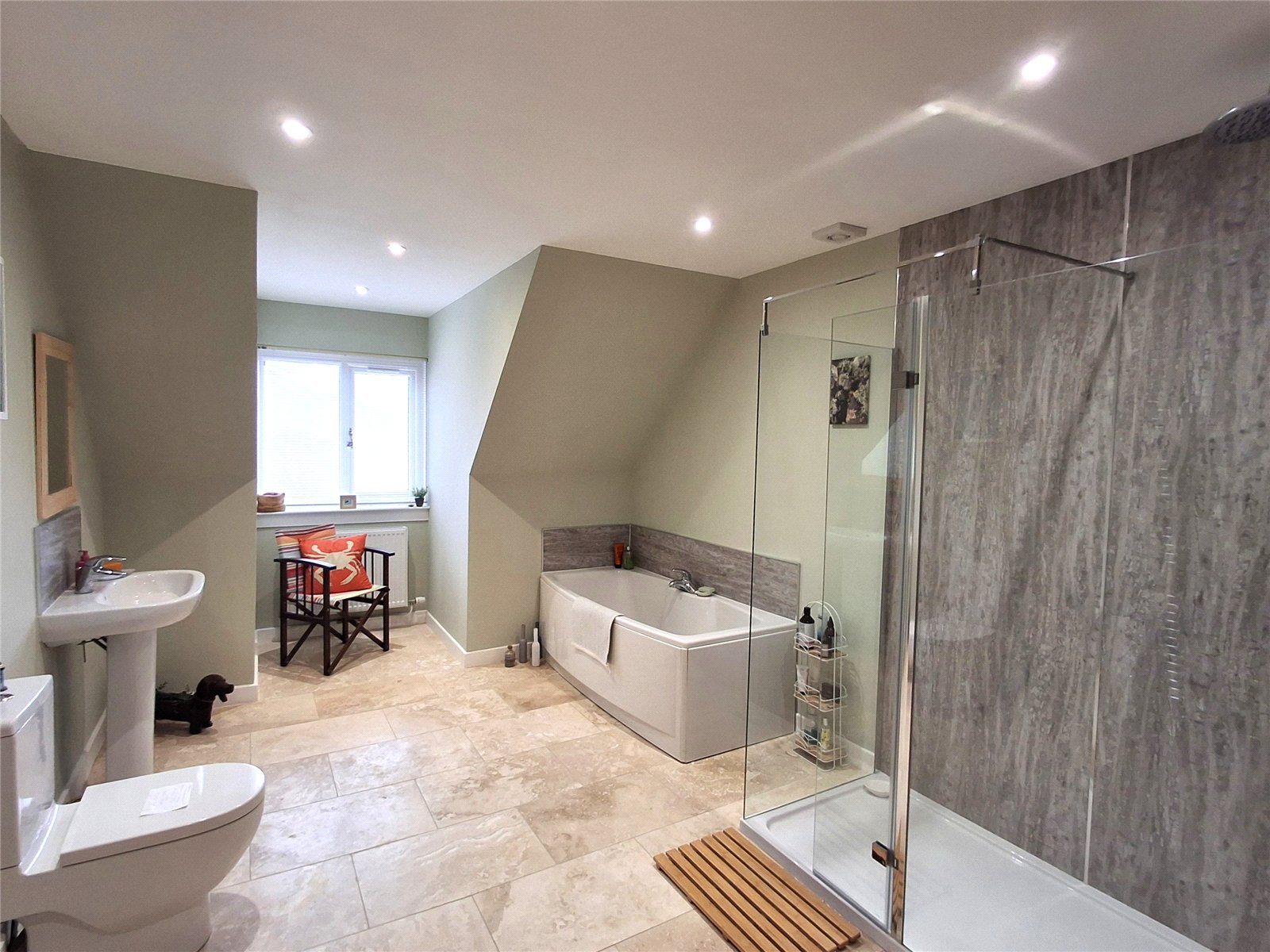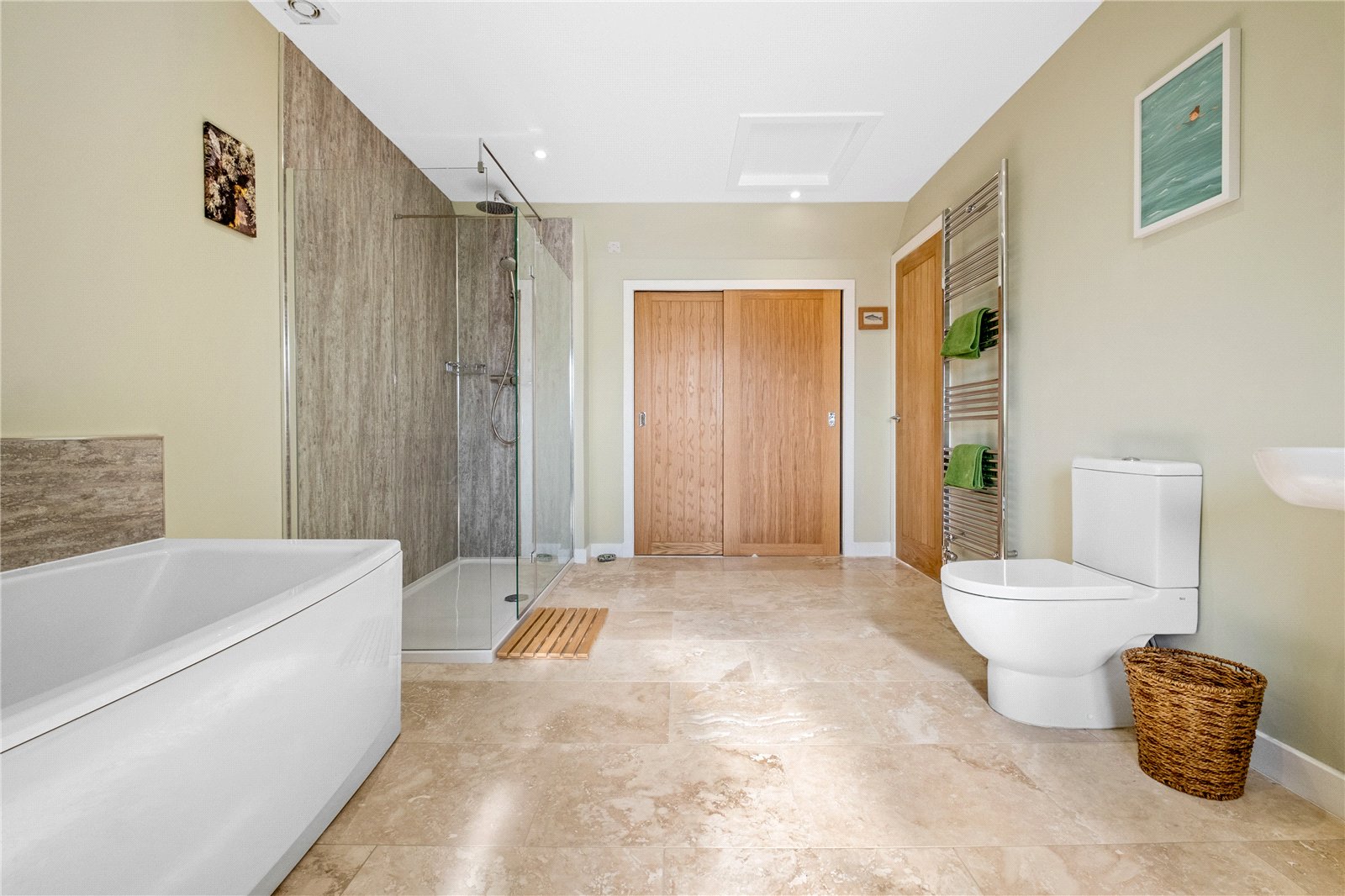 On the upper floor, the principal bedroom is particularly spacious and features a front-facing window with open views, along with three sets of mirrored wardrobes providing excellent storage. There is a large family bathroom with WC, wash hand basin, bath and separate shower with wet wall panelling and a drench head shower. There is natural travertine flooring with electric underfloor heating.