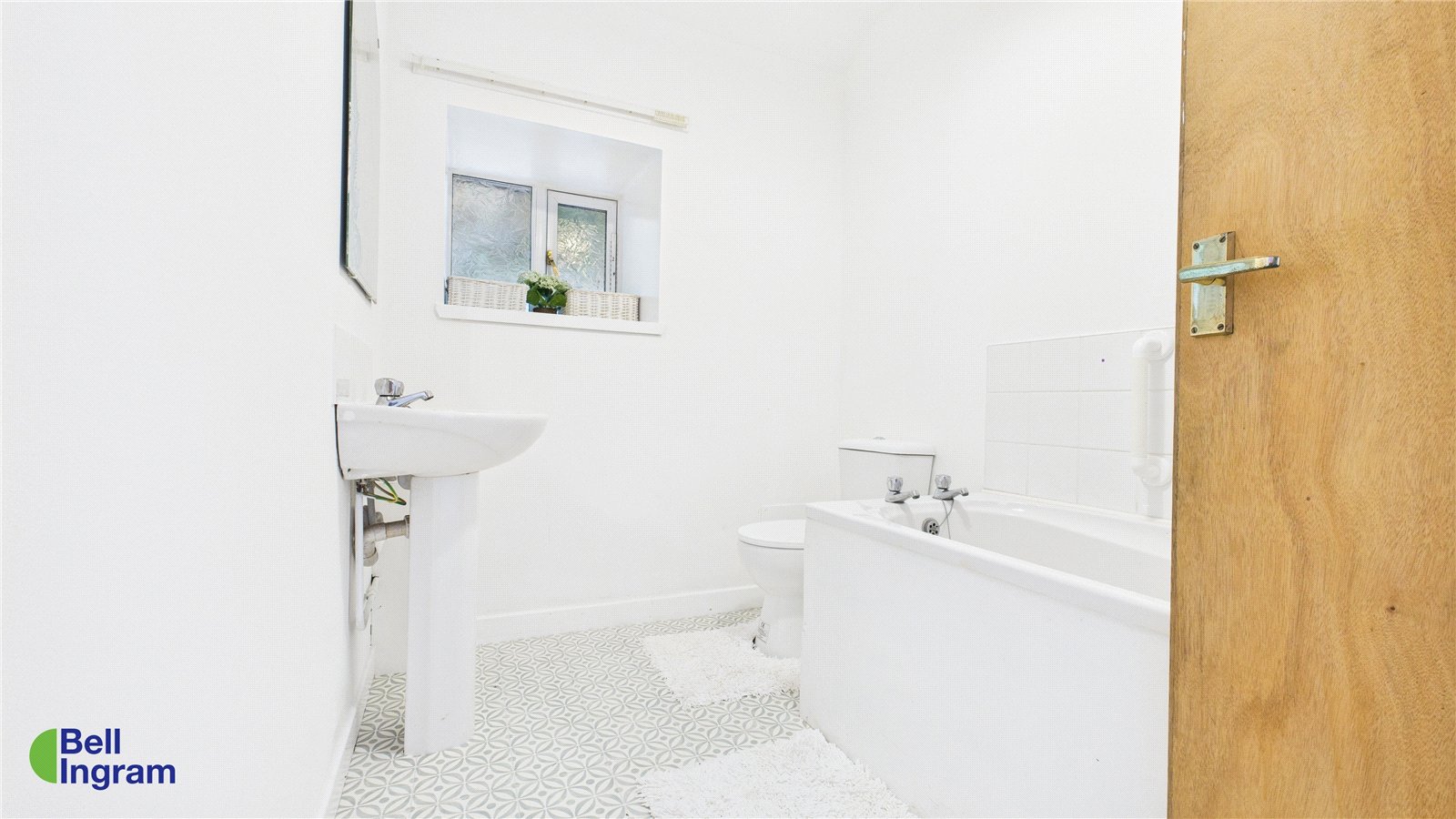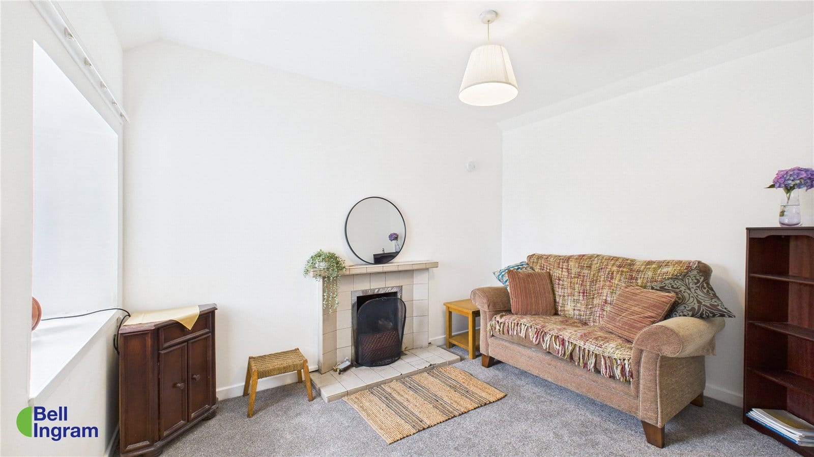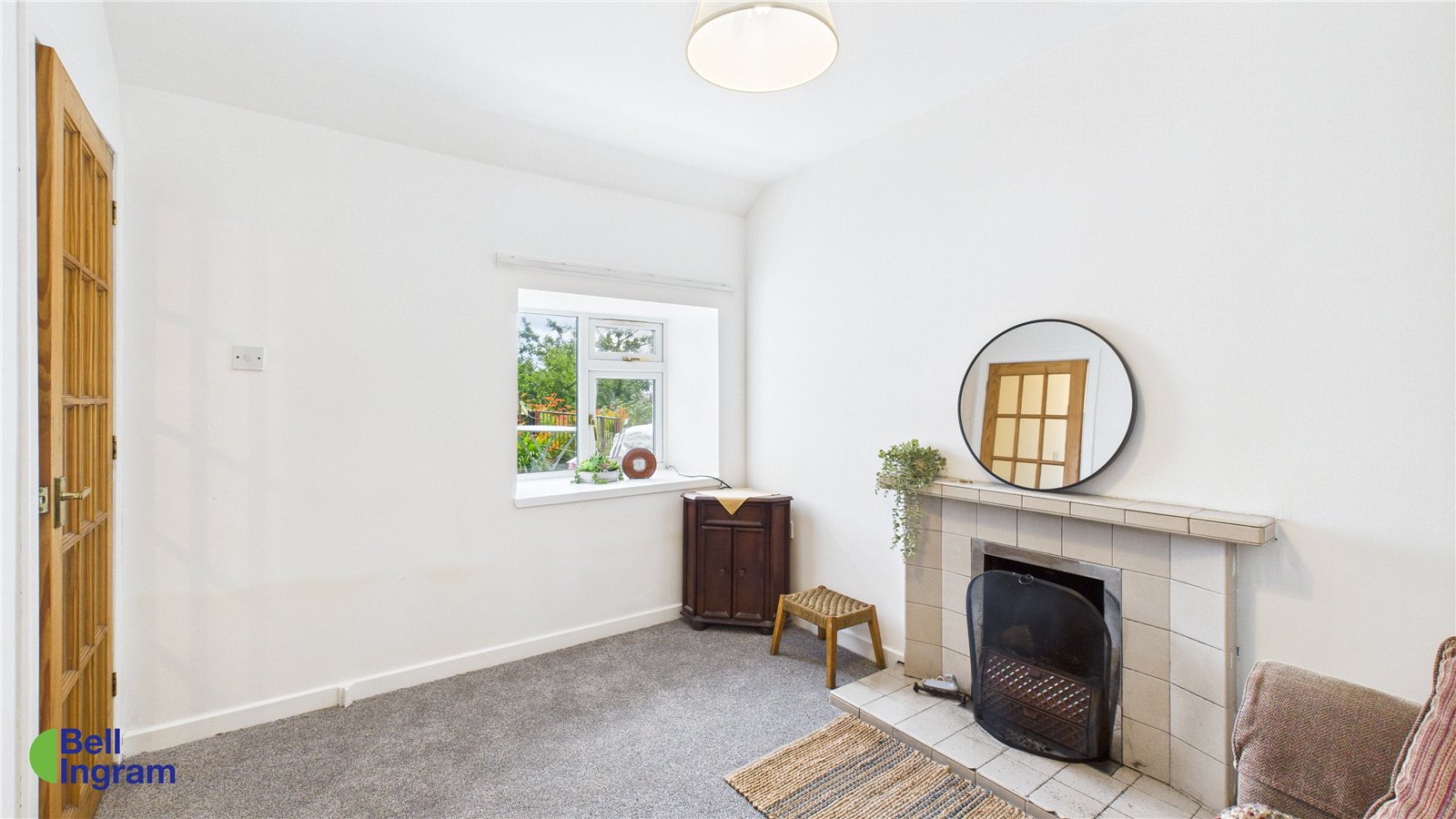 A doorway leads from the kitchen through to the central hallway which links all rooms within the property. To the left, the family lounge is a cozy room, warmed through by an open grate fireplace sat within a tiled fire surround. The front window offers views out to a small courtyard which is positioned to the front of the house.