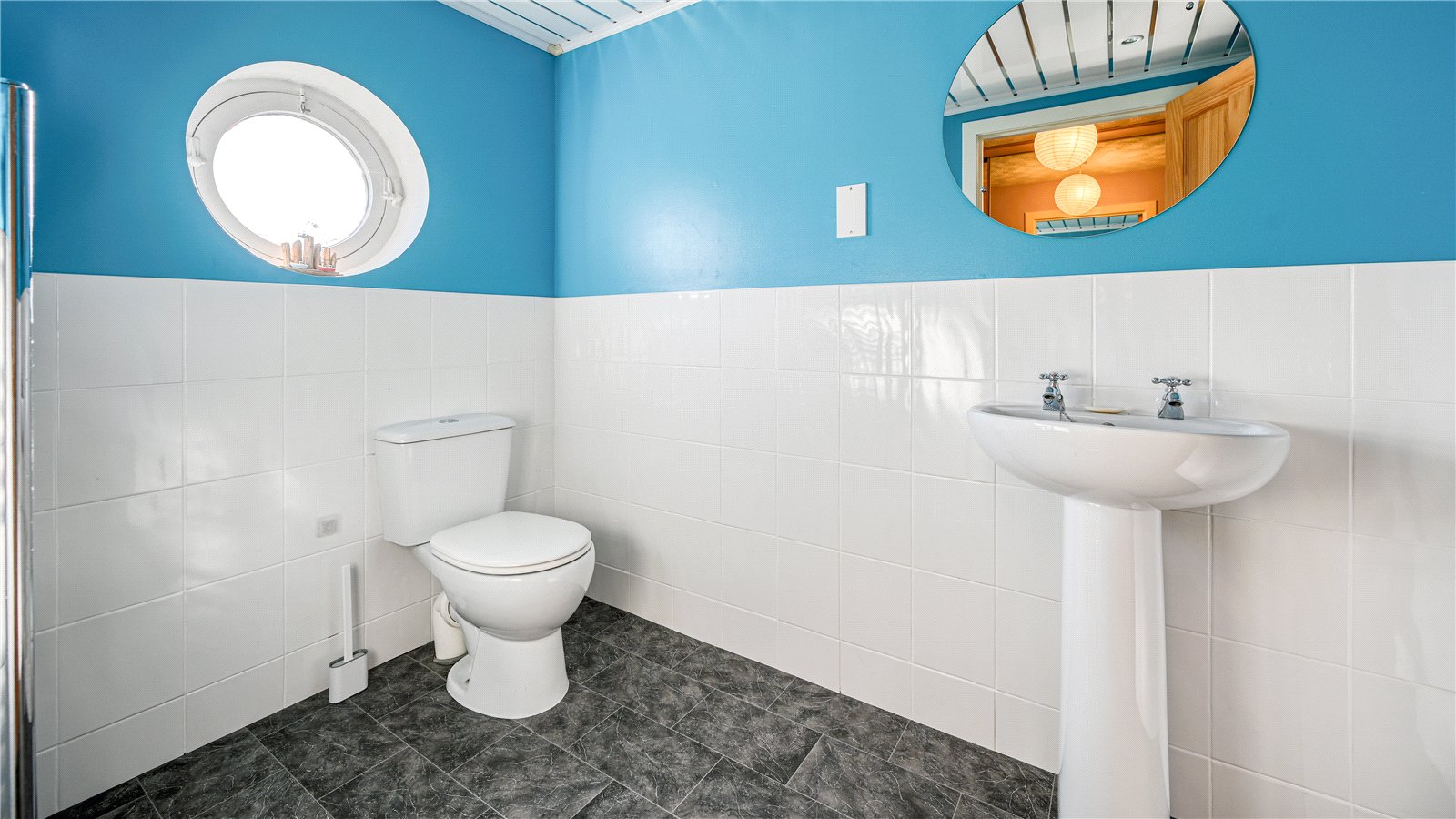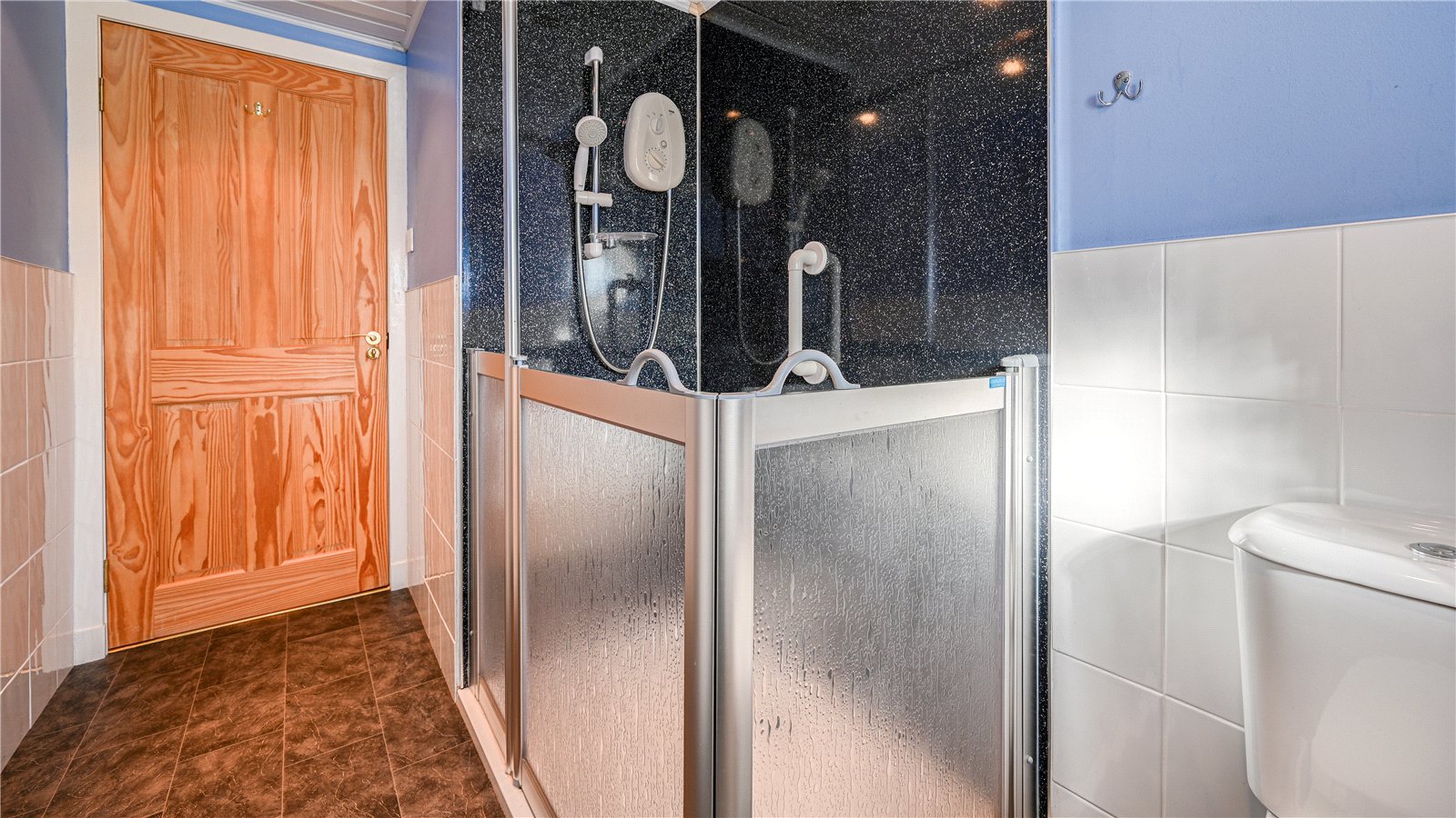The main shower room sits off the hall and has a WC and wash hand basin in white and a shower area with wet wall panelling around in electric shower over. The shower room is tiled to half hight.