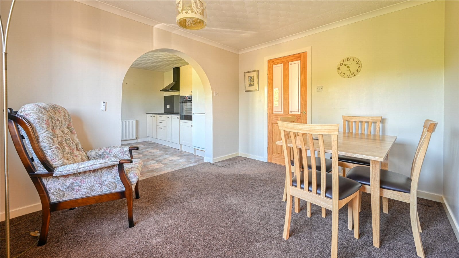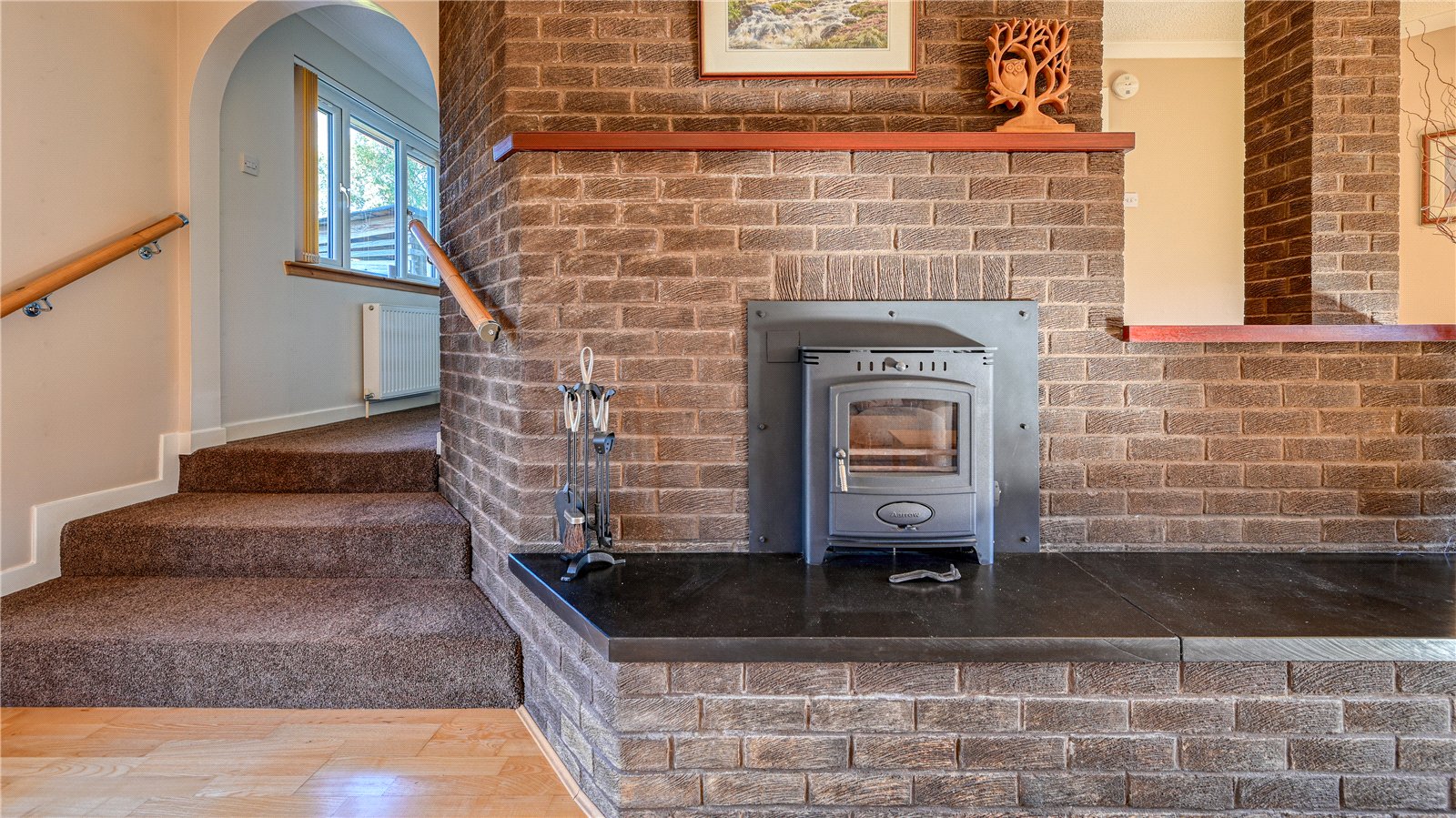 A half-glazed door leads to the main hallway. To the left is a door to the living room. Three steps take you down to this spacious room which has three windows to the front overlooking the front garden and patio doors to the rear to the back garden. The sitting room has a wooden floor and a feature fireplace with wood burning stove with brick surround.