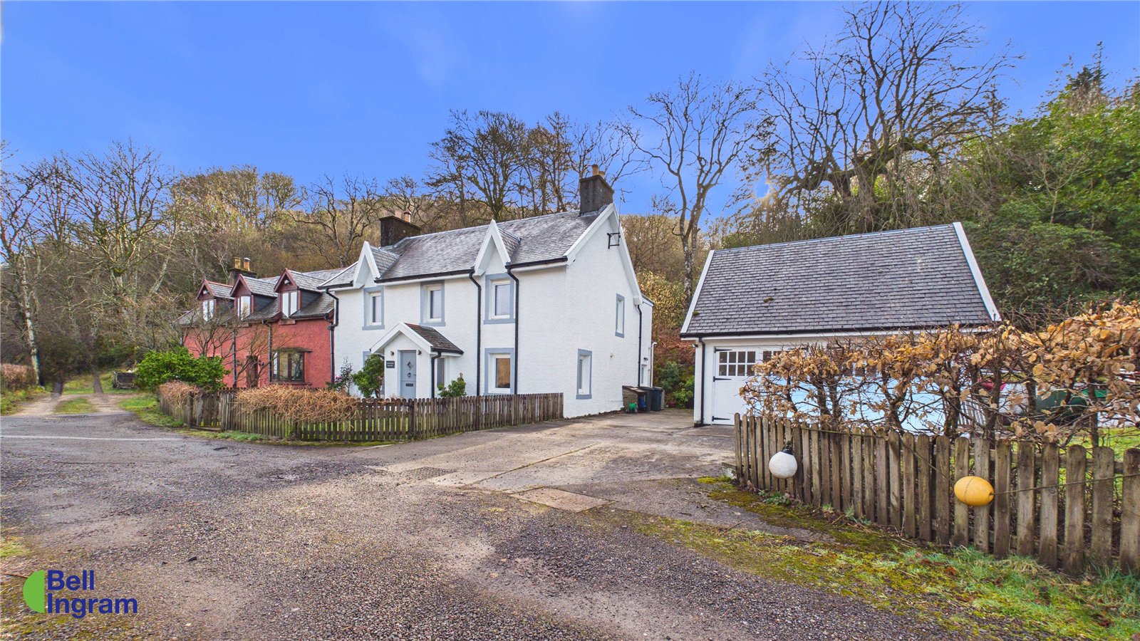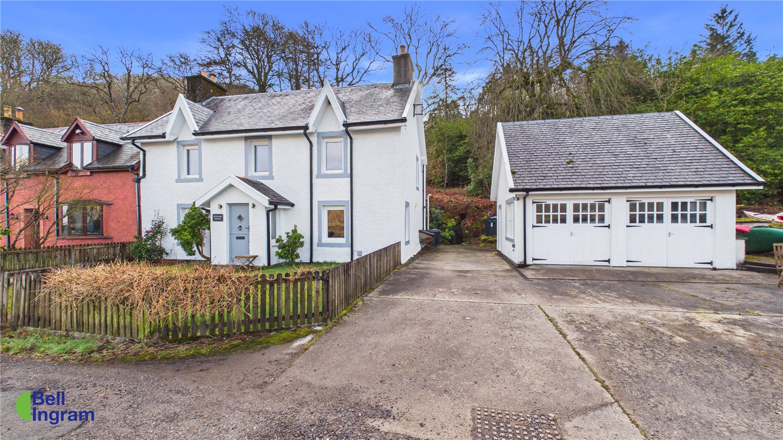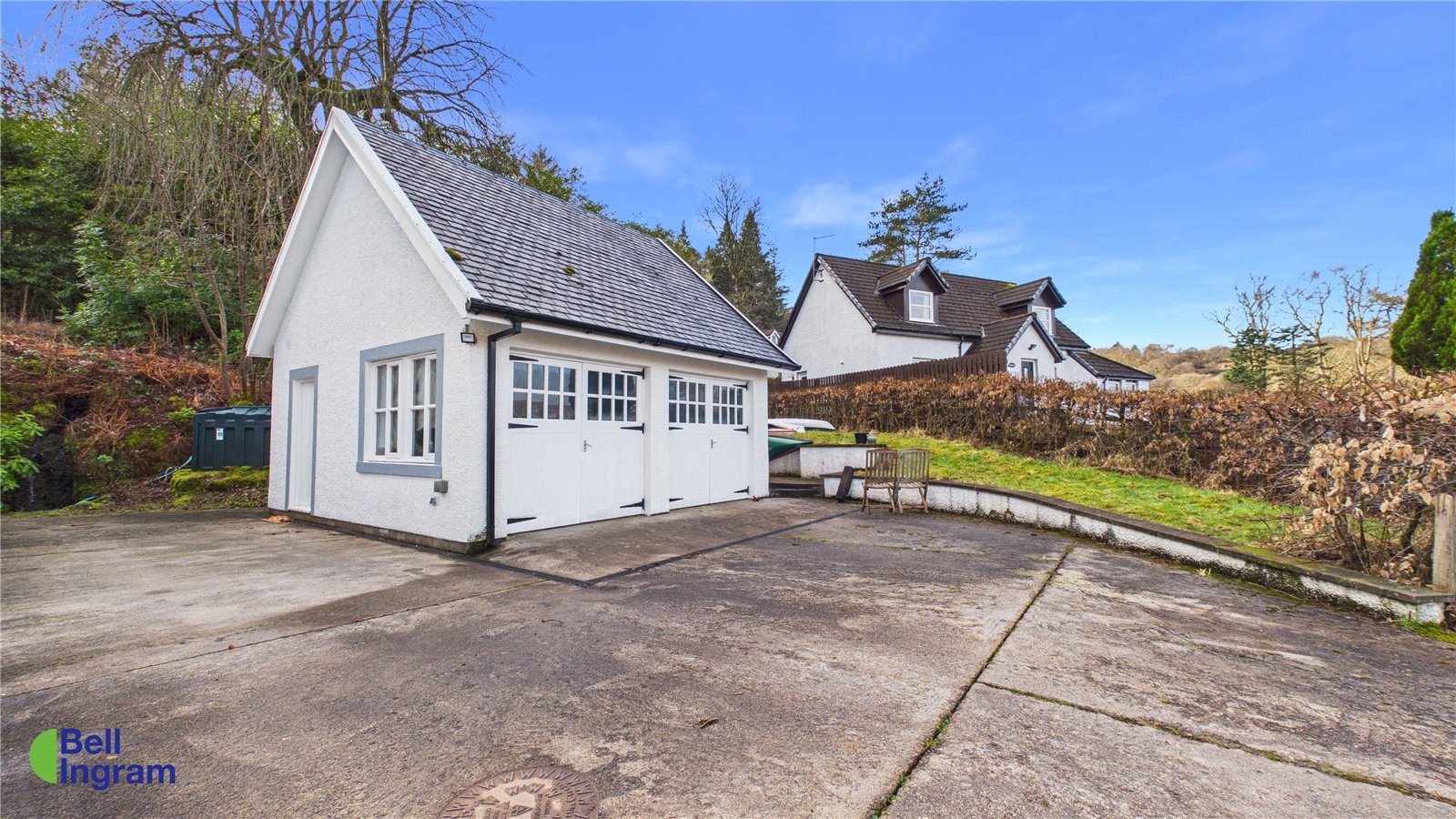 Externally, the property is accessed from the road via a shared track leading to a private driveway. A detached double garage offers secure parking for two vehicles and is currently configured for storing outdoor equipment, bikes and garden machinery. The grounds provide ample parking for multiple vehicles, including space for boat storage.