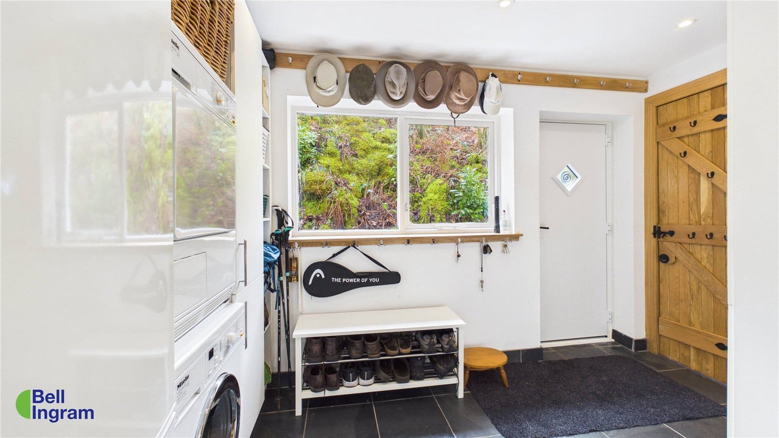 To the rear, a generously sized utility room provides ample storage and houses a fridge freezer, washing machine, and tumble dryer. A rear door offers convenient access to the garden, while a ground floor shower room features a walk-in shower and white WC. A storage cupboard contains the modern hot water cylinder.