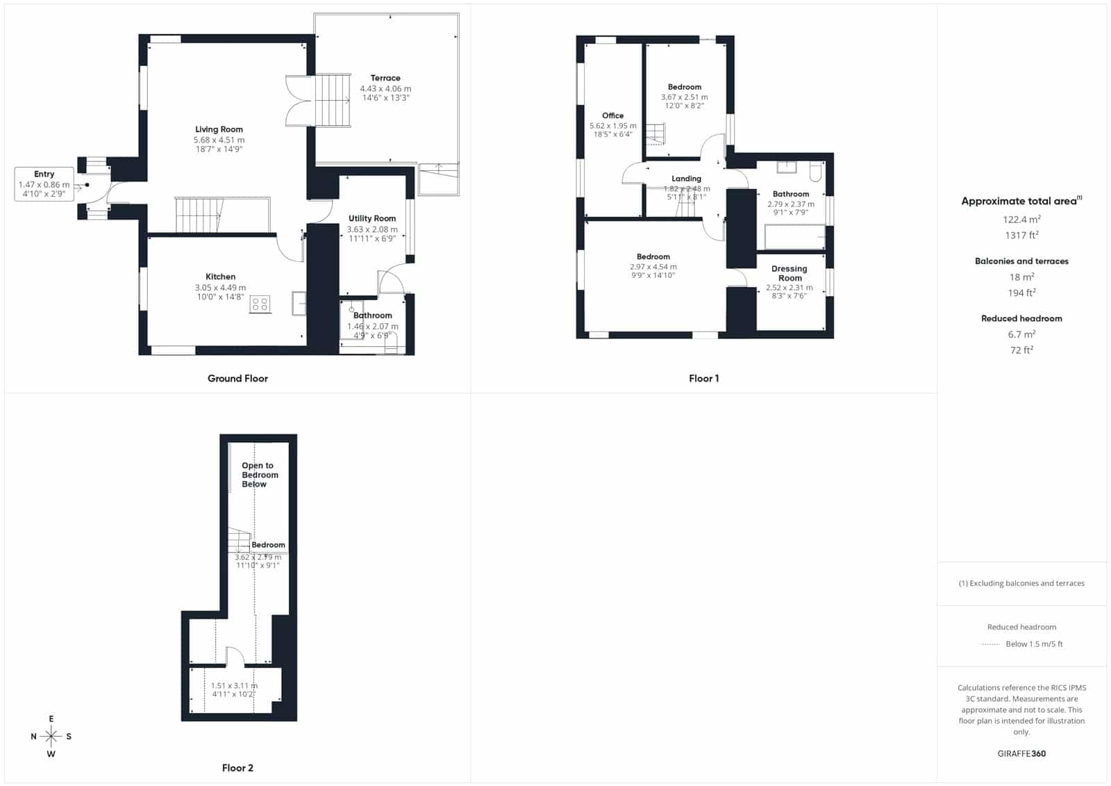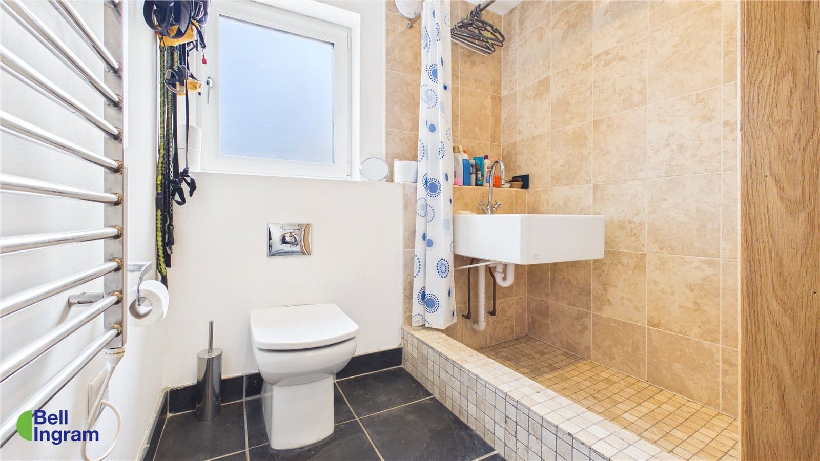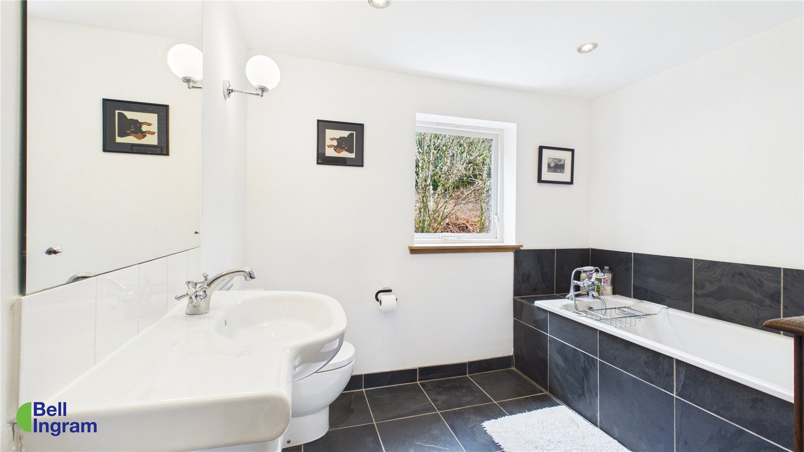 The family bathroom is also located on this level, featuring a stylish black tiled floor contrasted with crisp white walls. A full-size bath and modern white suite complete the space.
