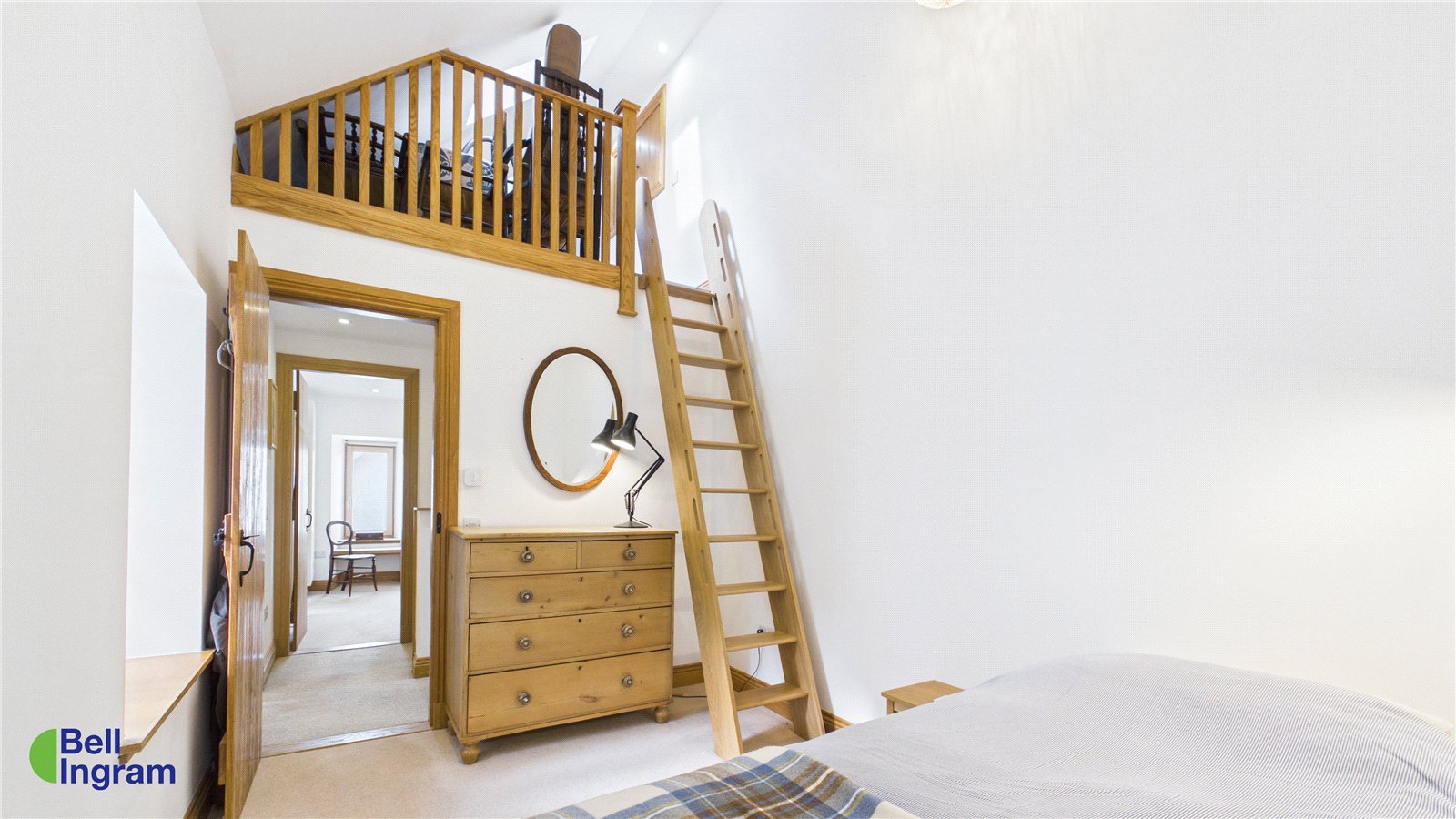 Adjacent is a well-appointed bedroom. A clever double-height ceiling design incorporates a gallery area accessed via a ladder-style staircase—ideal for additional storage or a quiet study nook. The principal bedroom, positioned to the right, benefits from stunning coastal views and includes a sizable walk-in wardrobe located at the rear.