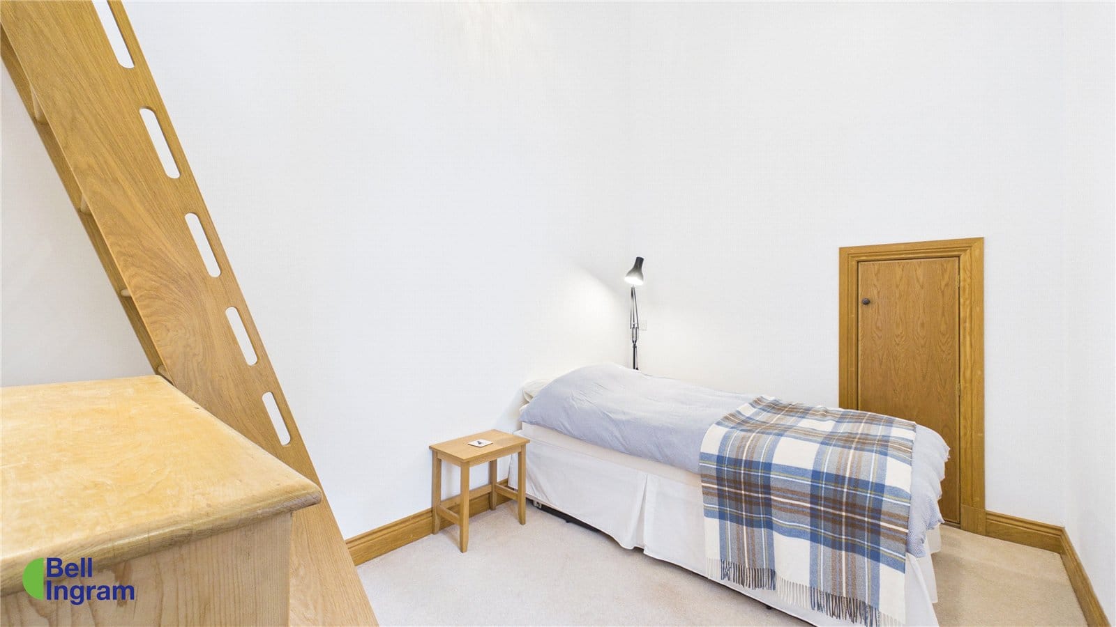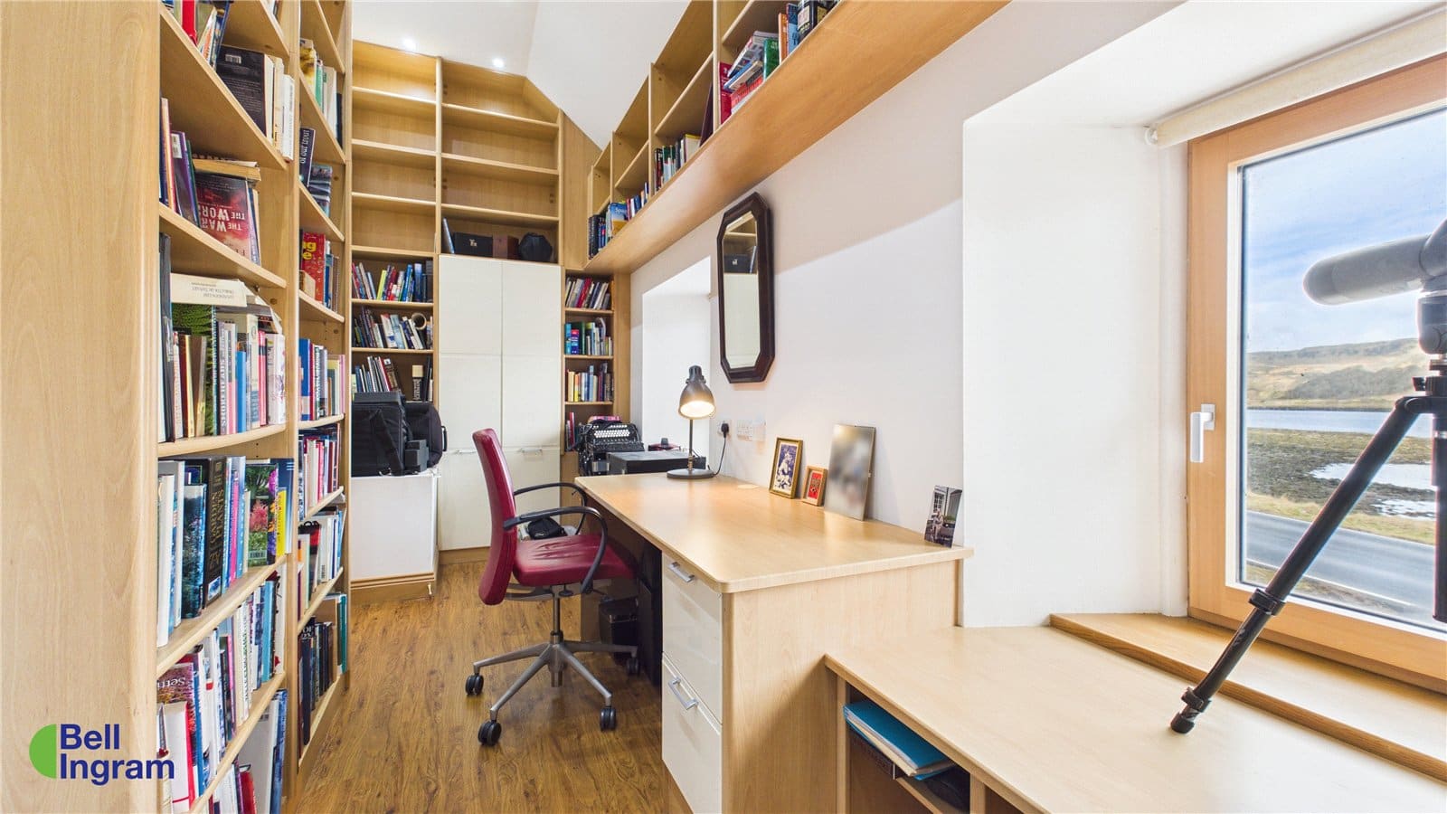 A carpeted staircase leads from the lounge to the upper floor landing. To the front of the property, the bedroom has been converted to create a bespoke library / office. This impressive room boasts a vaulted ceiling and high-level bookcases, with twin windows framing picturesque views to the front.