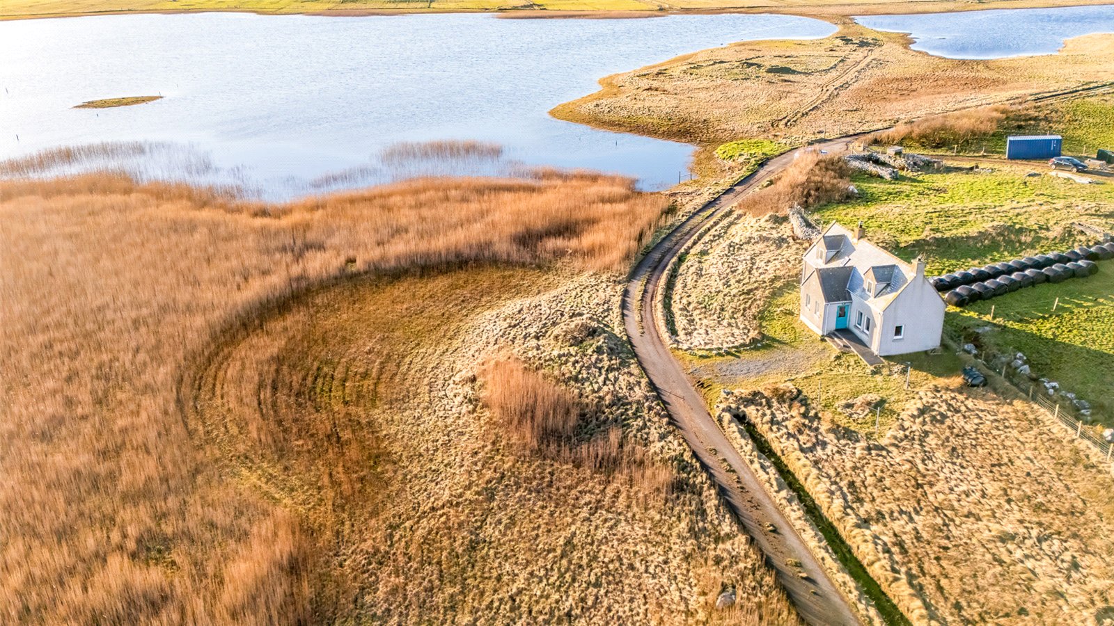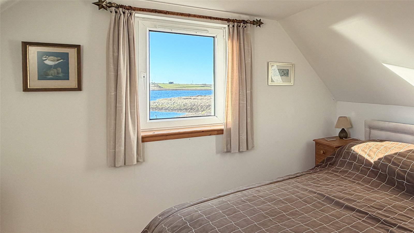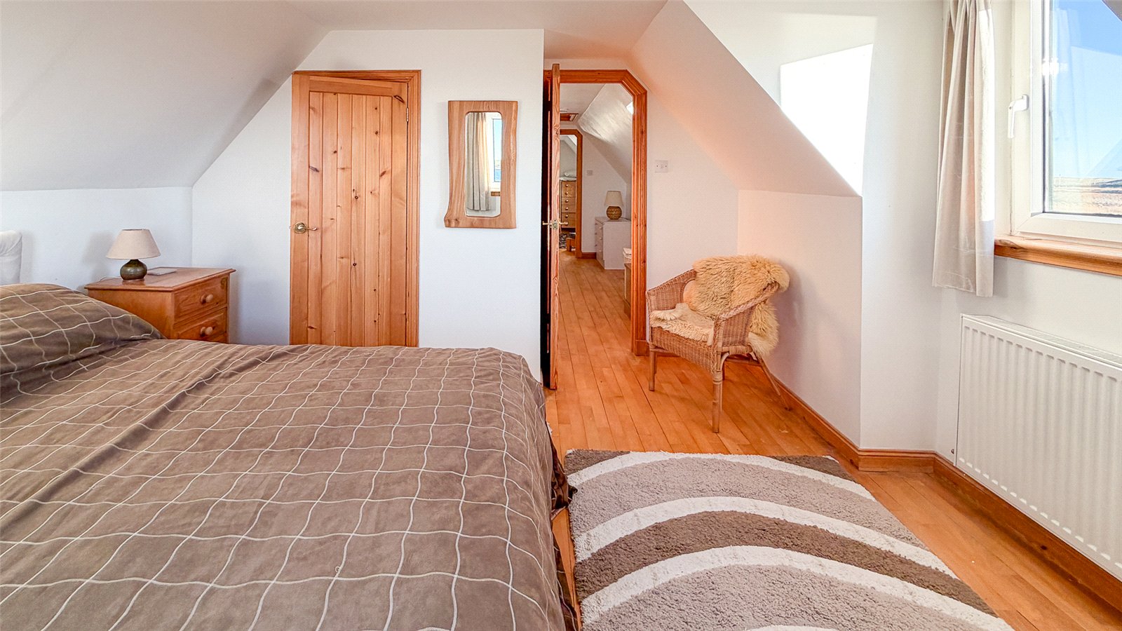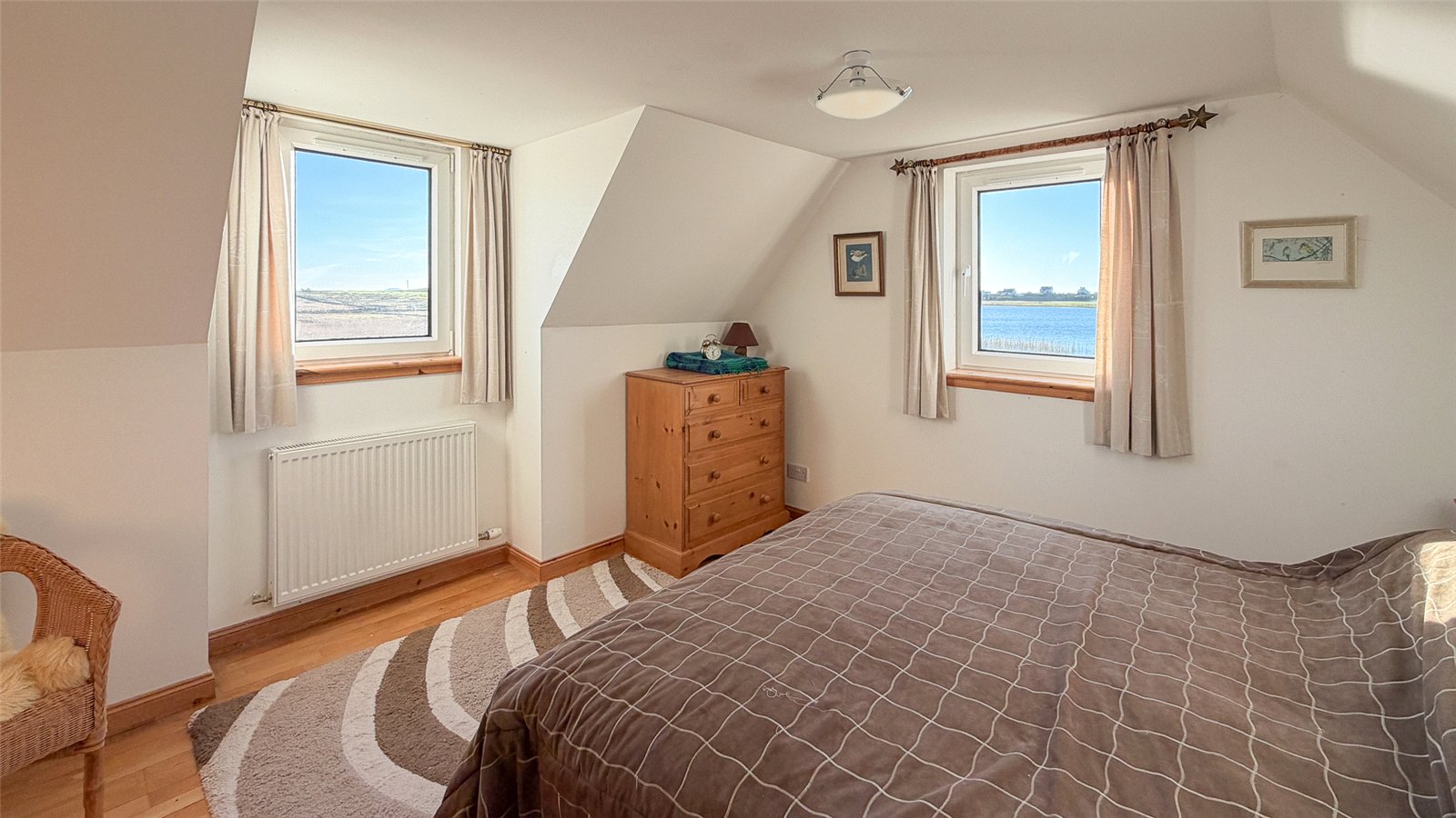 Stairs lead to the first floor, where there are two double bedrooms. Bedroom one has dual-aspect windows to the front and side with far-reaching views over the loch and surrounding countryside. Bedroom two has a front-facing window with rural views.