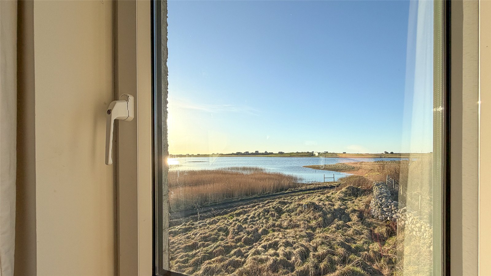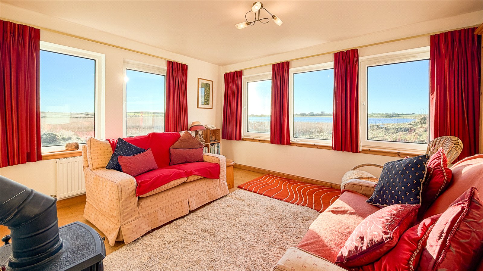 Also to the left is the sitting room, which features dual-aspect south and west-facing windows overlooking the loch, and a central wood-burning stove set on a slate hearth.