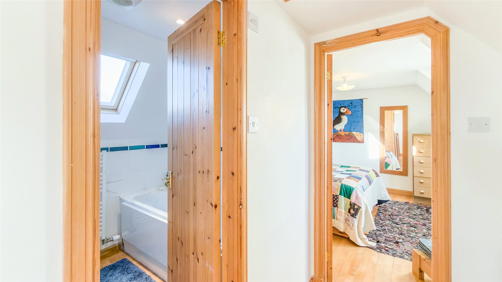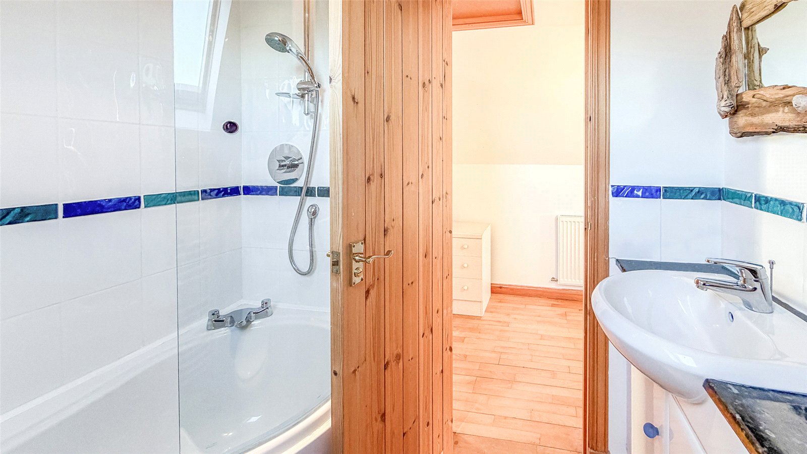 The first floor also includes a bathroom with WC, wash-hand basin set in a high gloss vanity unit, and a fully tiled bath with mains shower over.