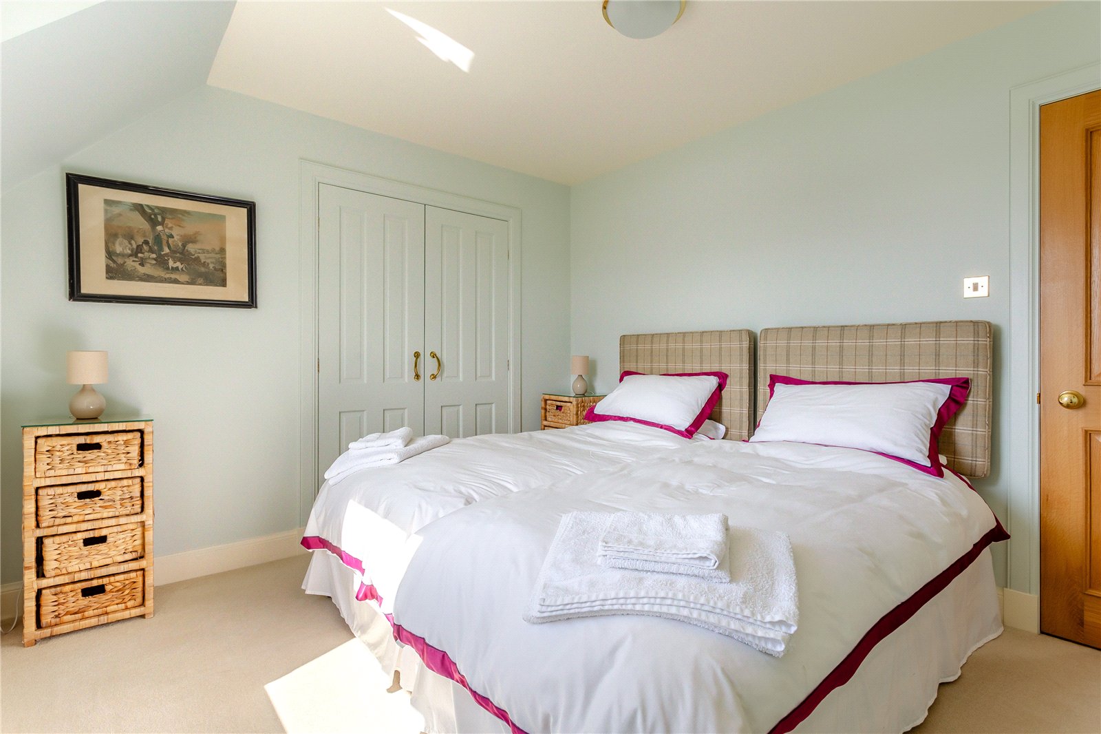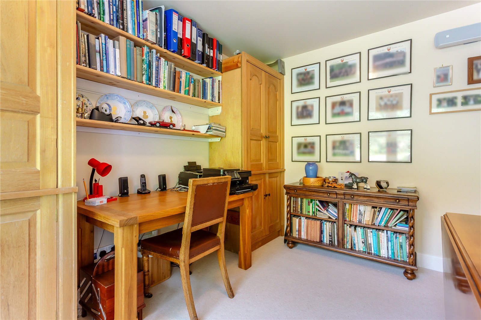 Returning to the main hallway, there is a built-in cupboard, a WC with wash hand basin, and bedroom four, currently used as an office, which overlooks the garden.