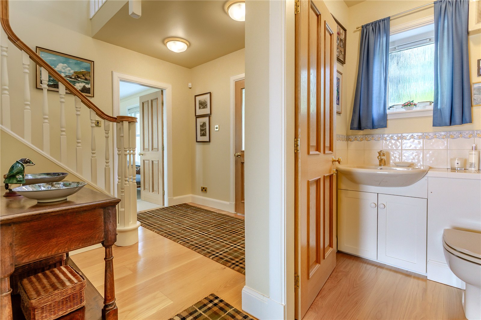 A hardwood door opens into the entrance vestibule, which has slate flooring and a double cupboard providing good hanging space. A glazed door leads through to the main hallway.