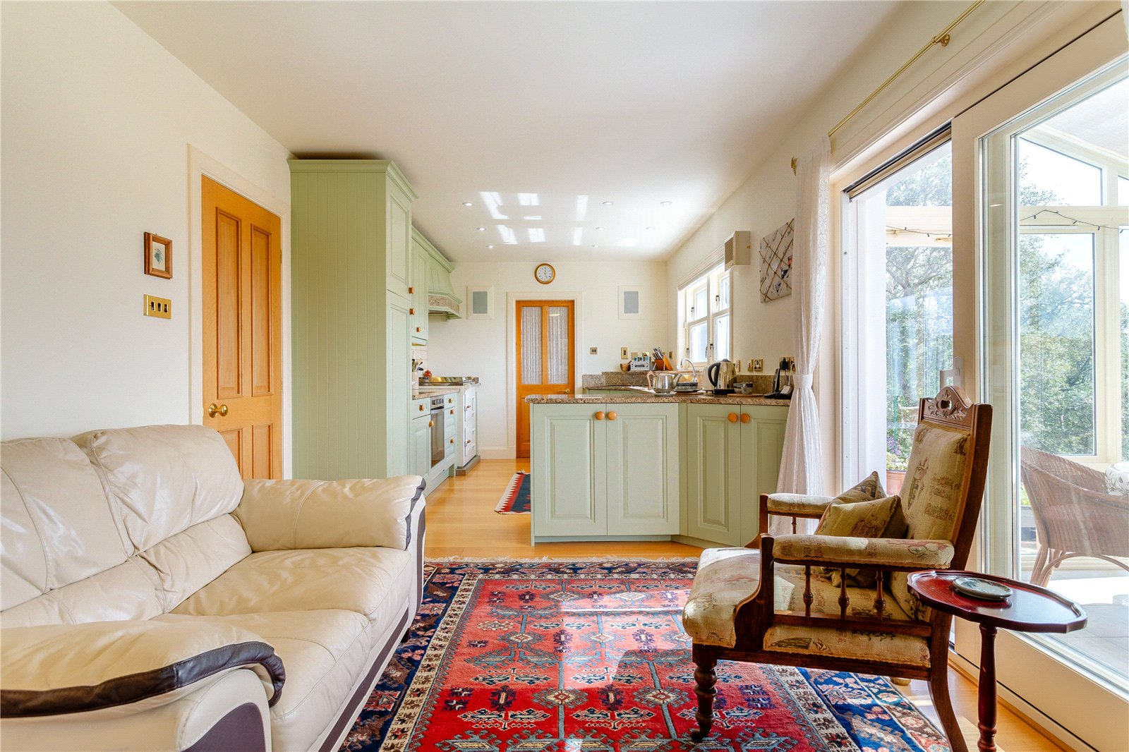 From the dining area, glazed French doors open to the kitchen, which includes a seating/snug area and French doors open to a conservatory. The conservatory is glazed on all sides, with tiled flooring and a door to the garden, making it a useful additional living space with panoramic views.