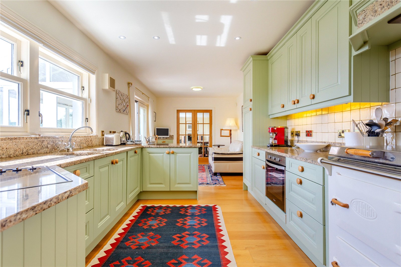 The kitchen is fitted with a range of floor and wall units in sage green with marble worktops. Integrated appliances include an oven, hob, grill, dishwasher and fridge, and there is also an electric Everhot range.