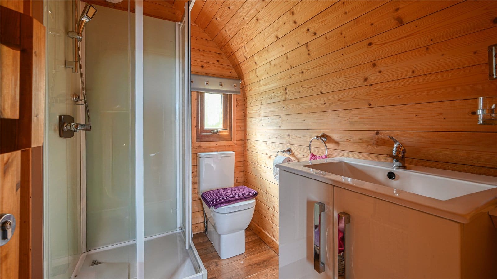 The modern Pod has an open plan kitchen/living/bedroom area. The kitchen has storage units and fridge, microwave and sink. There is a sofa bed and double bed.