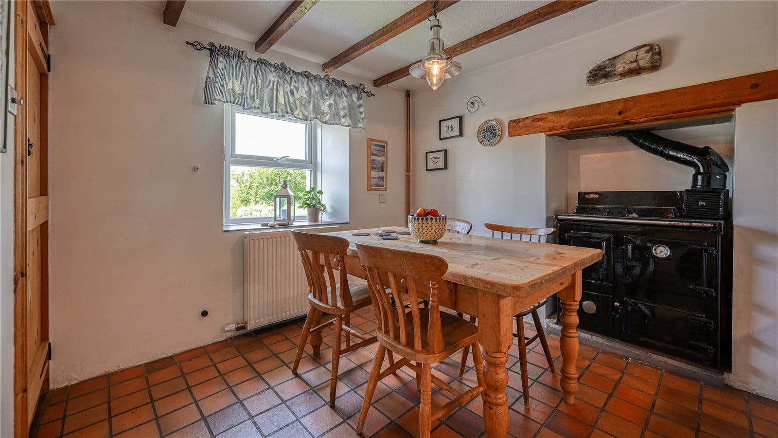 The dining area has plenty of space for a large table. There is a central feature of a Royal range (requires a replacement flue) which is inset with a wooden mantle.