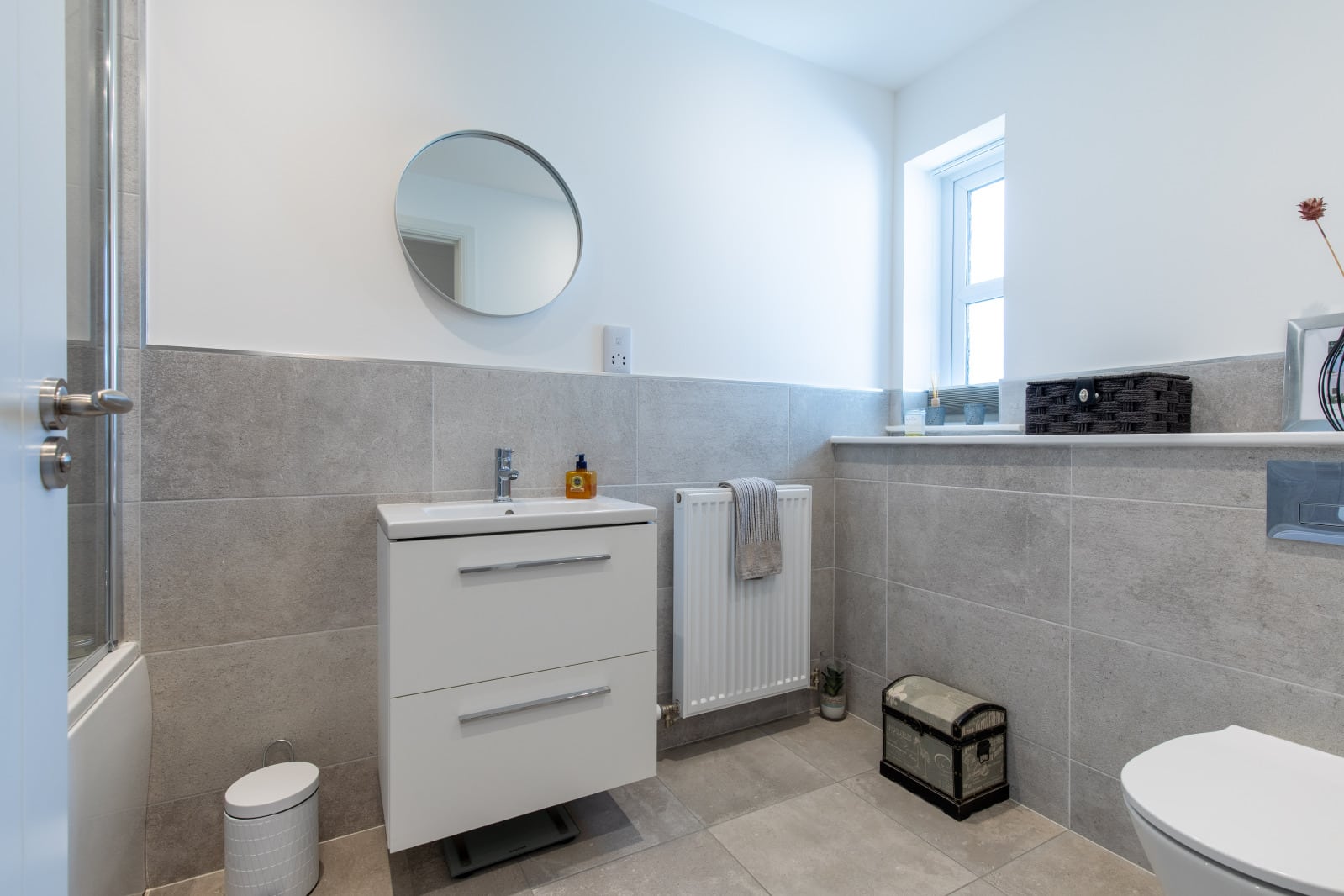 The family bathroom is fitted with a bath and overhead shower, WC, and wash basin. It has a tiled floor and wall tiling to dado height, with a window, also fitted with an integral blind, providing natural light and ventilation.
