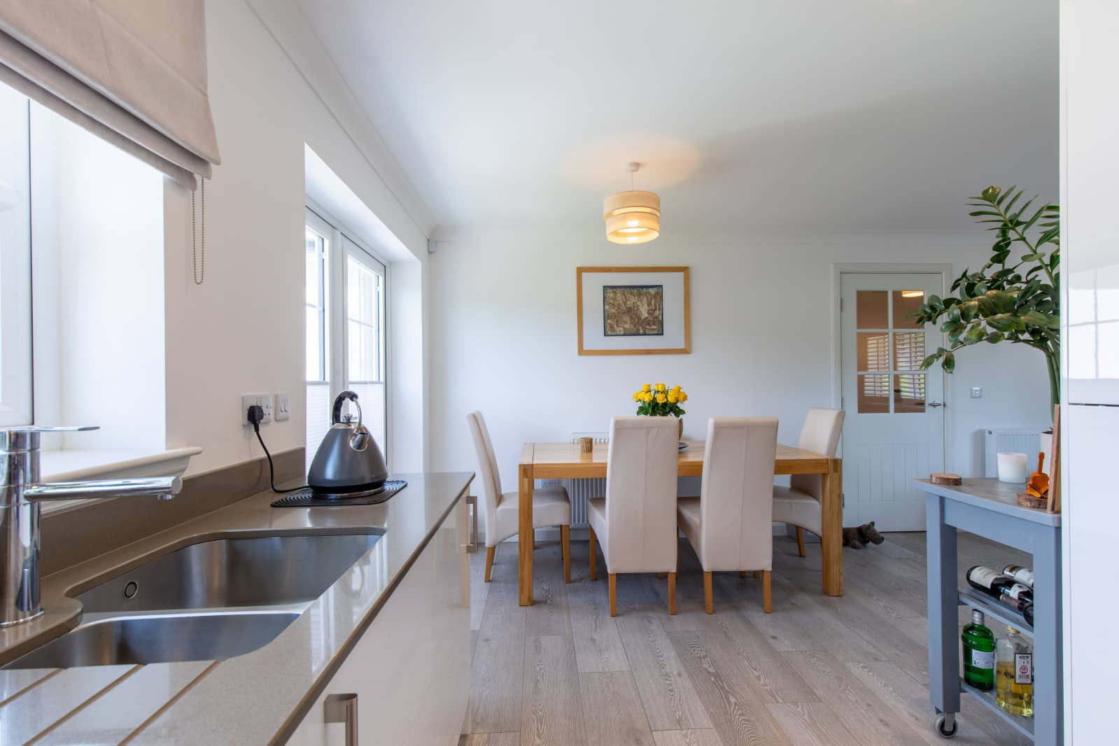 The well-appointed kitchen is fitted with a stylish range of gloss white base and wall-mounted units, complemented by ash quartz work surfaces. Integrated AEG appliances include an induction hob with extractor hood, double oven, and washing machine, and the dishwasher and fridge freezer are by Zanussi. A window overlooks the rear garden, while two glazed doors, fitted with integral sliding blinds, open directly onto the rear garden. There is ample room for a dining table and chairs, making it ideal for everyday meals and entertaining.