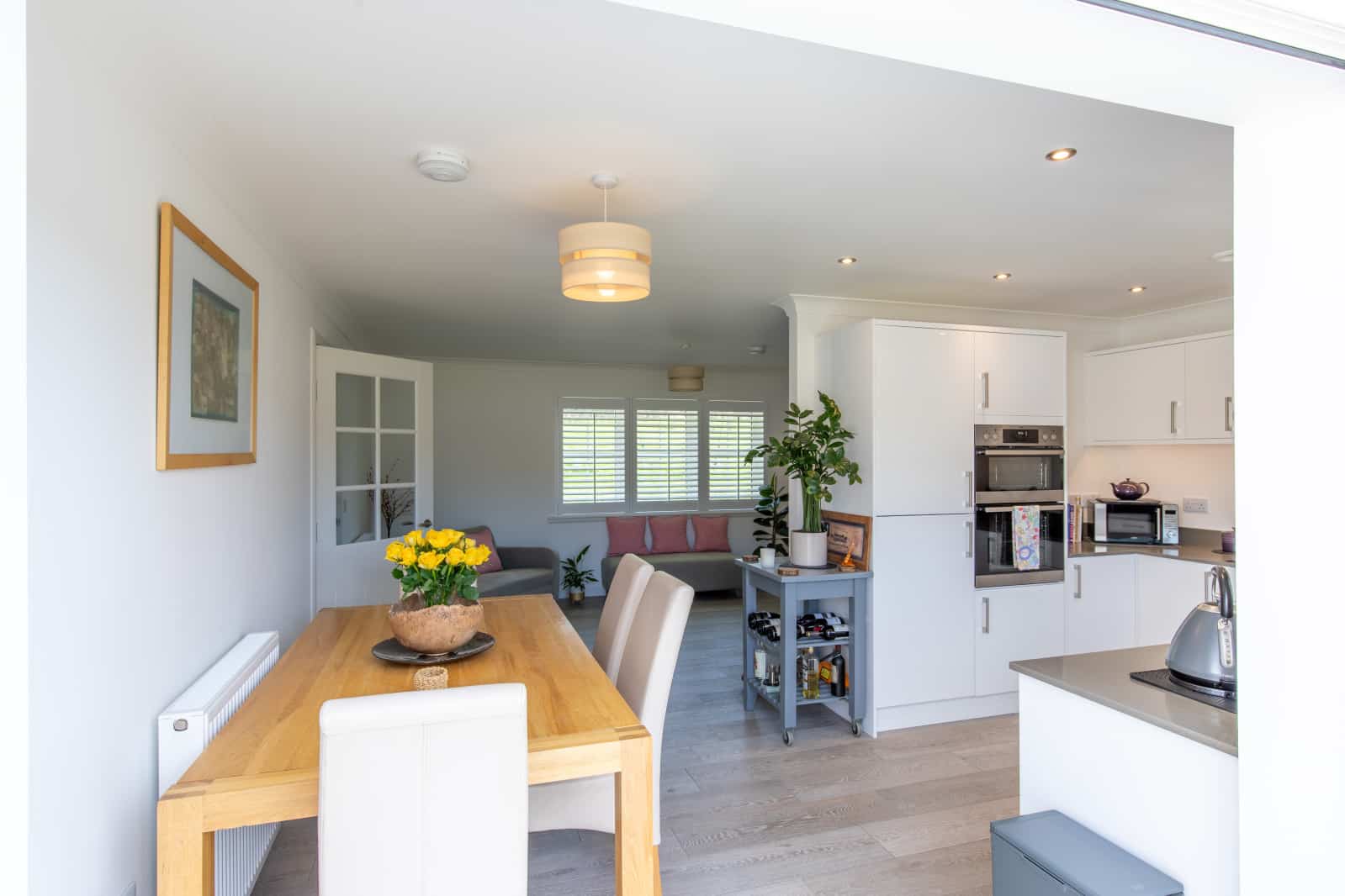 A solid entrance door with a glazed panel opens into a bright and welcoming reception hall. To the left, a generously proportioned sitting room has three windows that flood the room with natural light and overlook the front of the property. The sitting room then flows seamlessly into the open-plan kitchen, creating a sociable and spacious living area.