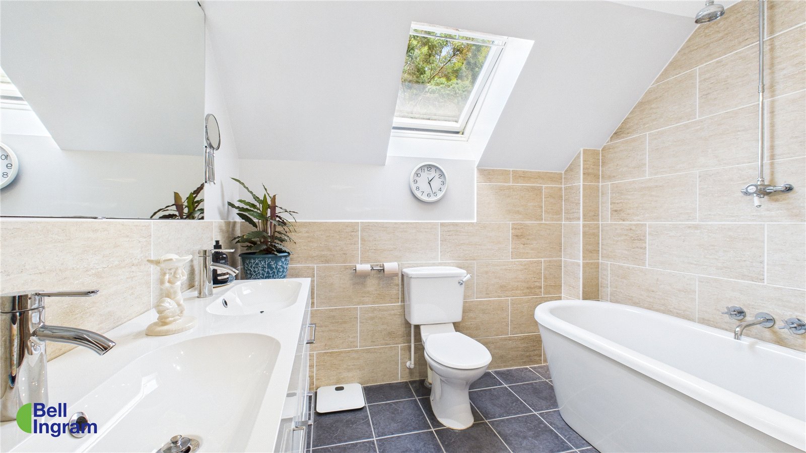 Upstairs, the first-floor landing leads to three well-proportioned bedrooms and a stylish family bathroom. The largest bedroom offers ample space for furnishings, while another includes built-in mirrored wardrobes. The recently updated bathroom features a full-sized bath with overhead shower, double washbasins, underfloor heating, and a Velux window that floods the room with natural light. A floor drainage point adds wet room functionality.