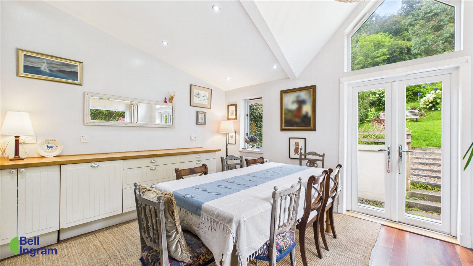 The open-plan kitchen/diner is a standout feature, with vaulted ceilings and abundance of natural light, leading directly to the rear garden via French doors. A practical utility room offers additional storage and laundry space, in turn giving access to a modern shower room which includes a large walk-in shower.
