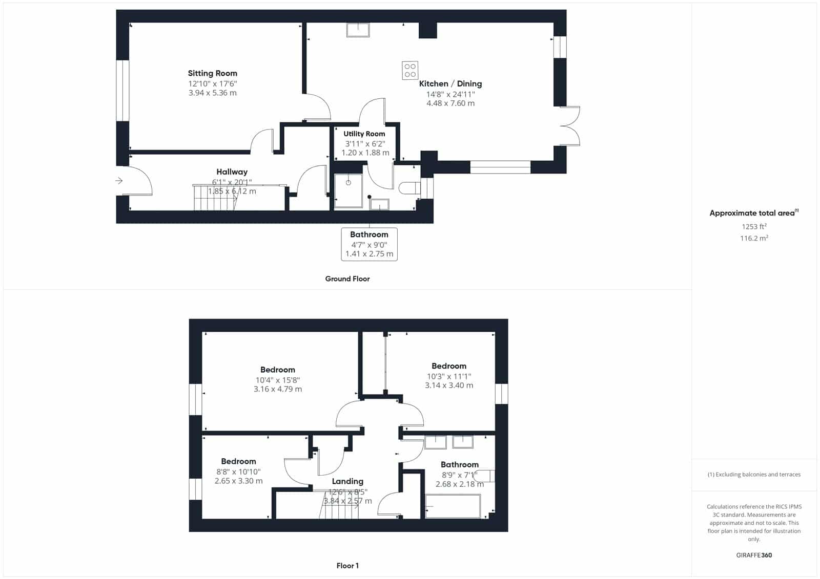 Upstairs, the first-floor landing leads to three well-proportioned bedrooms and a stylish family bathroom. The largest bedroom offers ample space for furnishings, while another includes built-in mirrored wardrobes. The recently updated bathroom features a full-sized bath with overhead shower, double washbasins, underfloor heating, and a Velux window that floods the room with natural light. A floor drainage point adds wet room functionality.