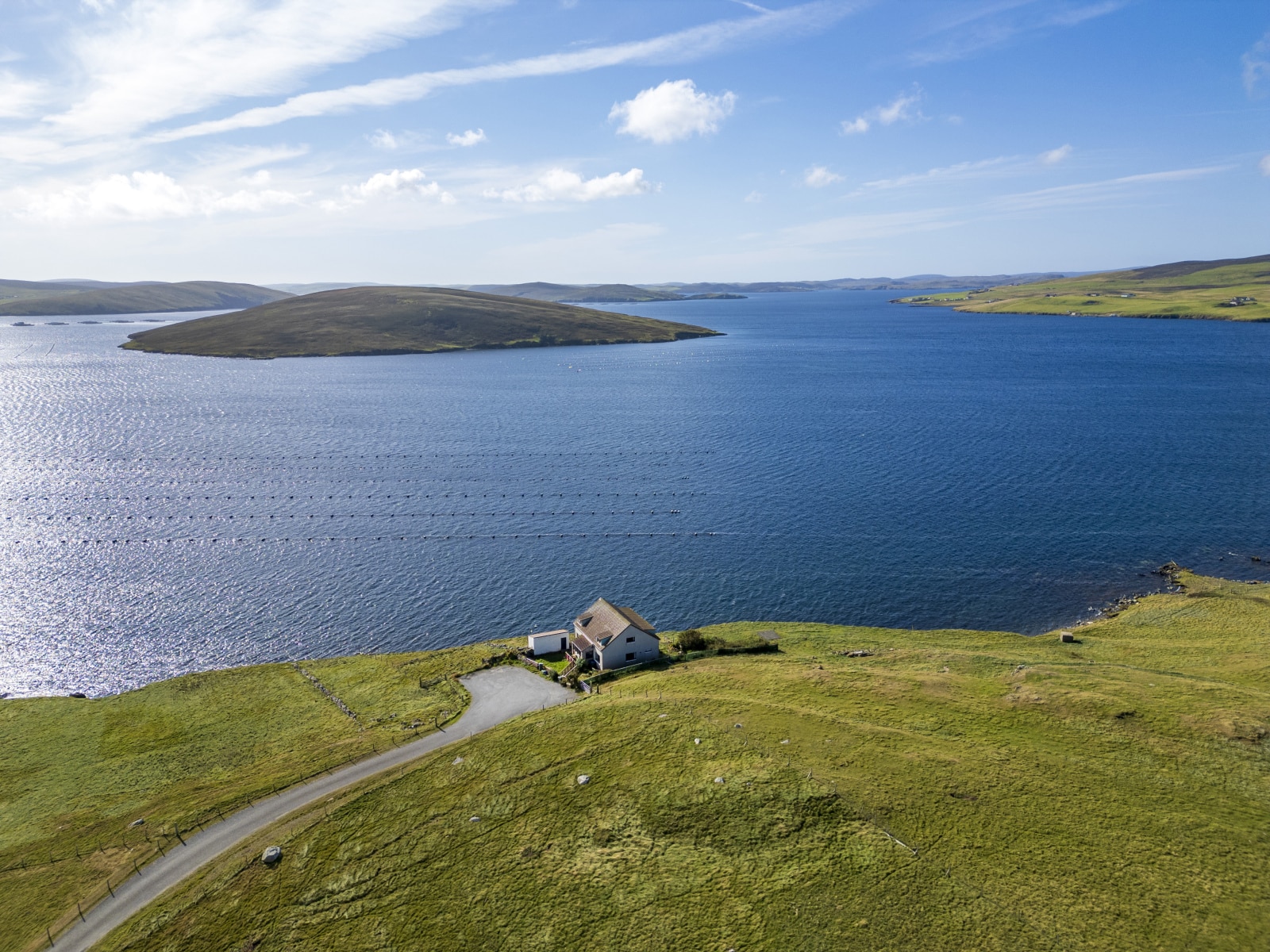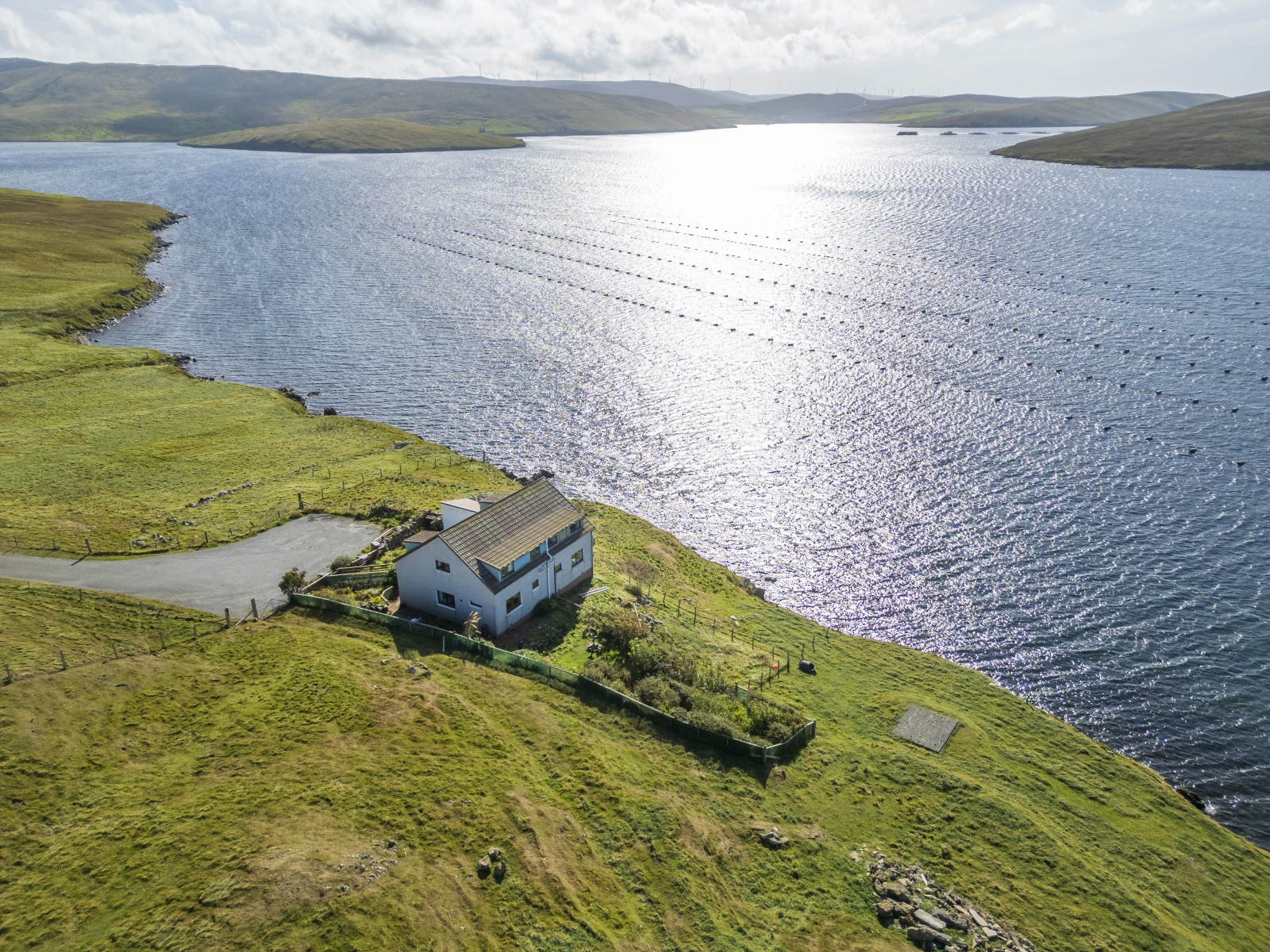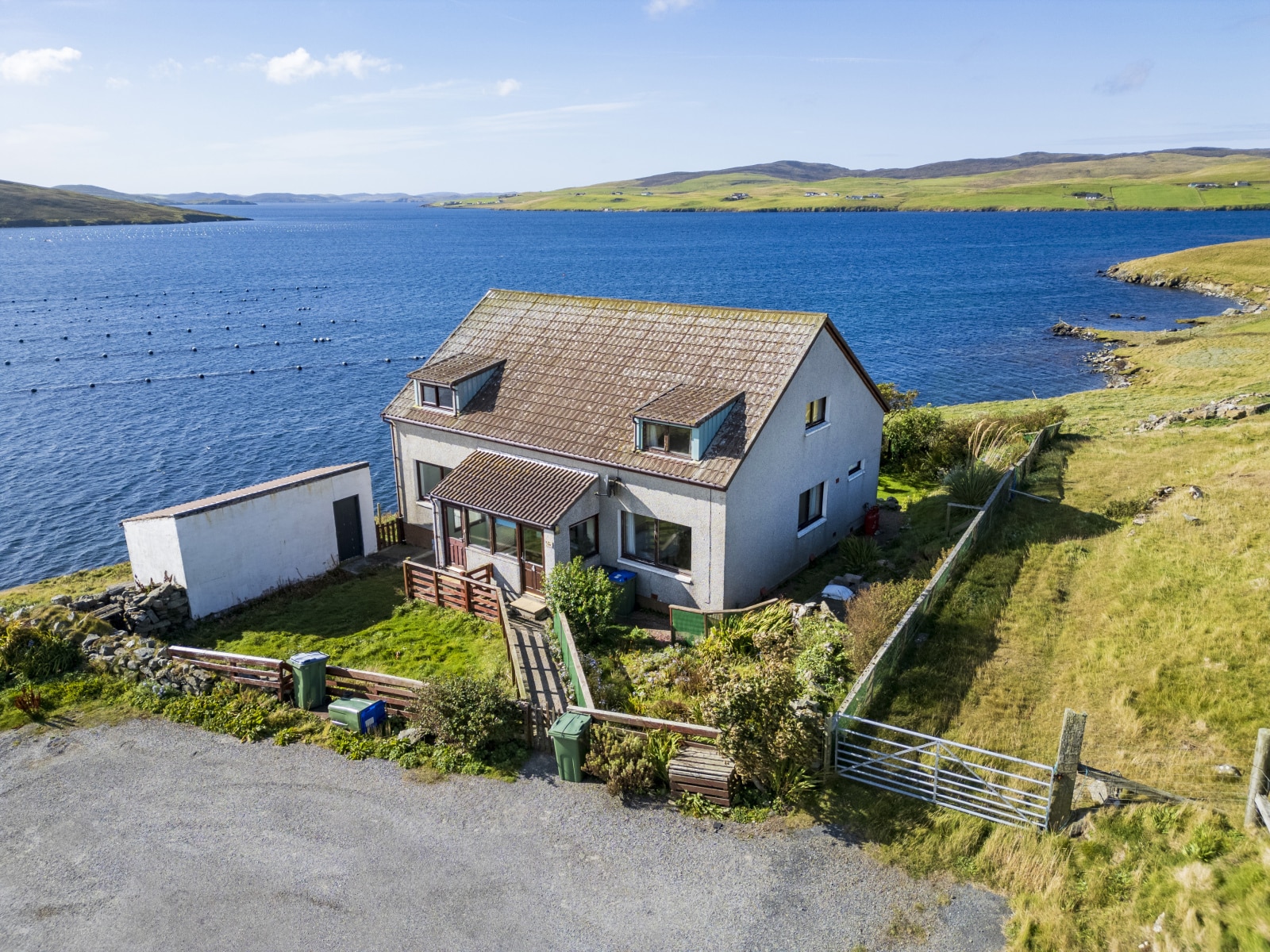 A three-bedroom semi-detached home sitting above the shoreline, offering breathtaking, panoramic views across the nearby voes and towards Linga Island